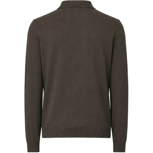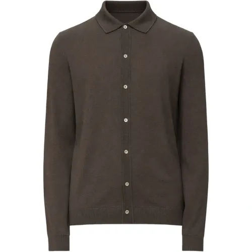 темно-коричневый кардиган на пуговицах с воротником, длинными рукавами и рубчатой вязкой