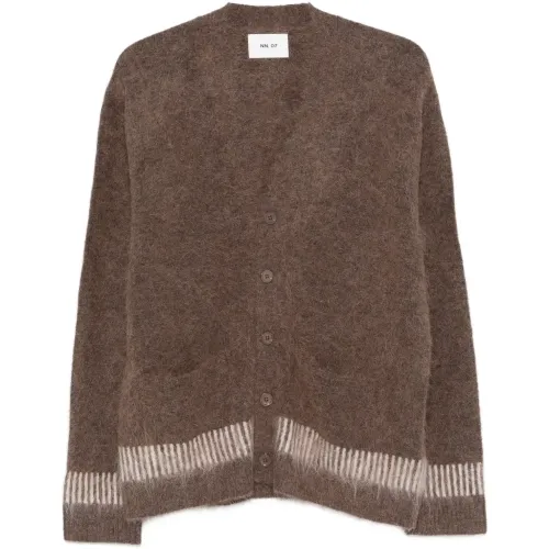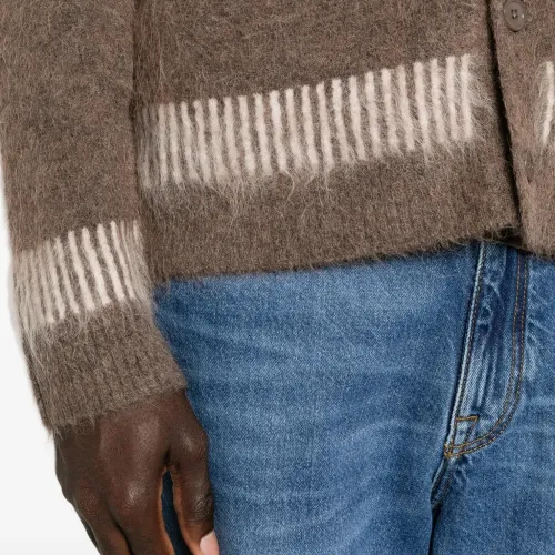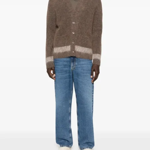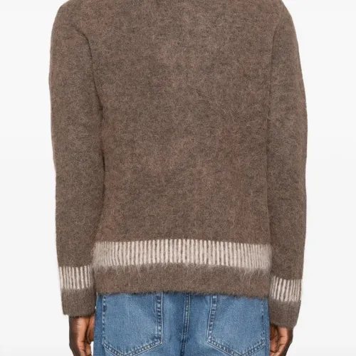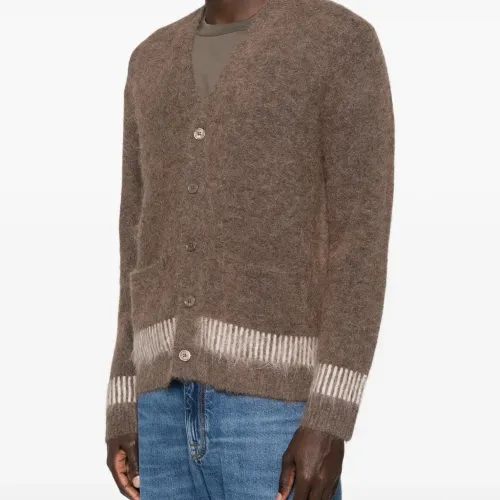 коричневая с полосатой отделкой, V-образным вырезом, застёжкой на пуговицах спереди и накладными карманами