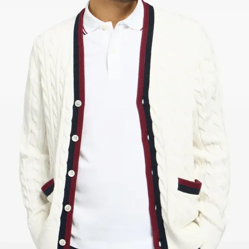 белый вязаный кардиган с косами, полосатой отделкой, застёжкой на пуговицы, накладным карманом и длинными рукавами