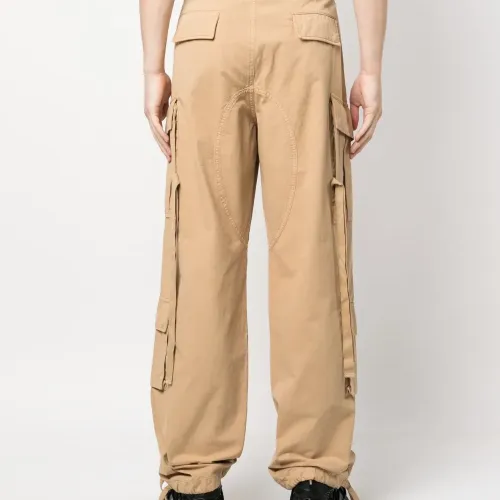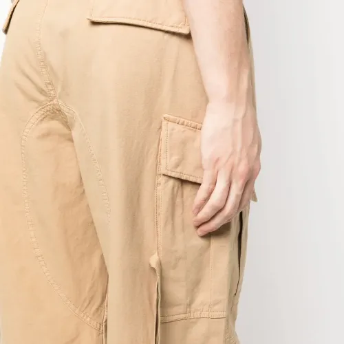Песочно-бежевый, хлопок, ремешки, петли для ремня, ширинка на пуговицах, два кармана по бокам, два кармана с клапанами сзади, накладные карманы и подол с кулиской.
