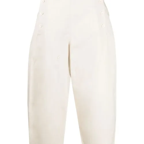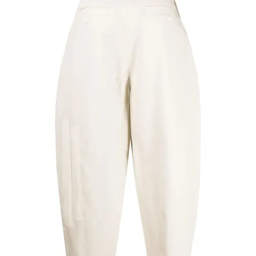 Застежка на пуговицах спереди, два кармана с листочкой сзади, завышенная талия, широкий крой и укороченная длина.