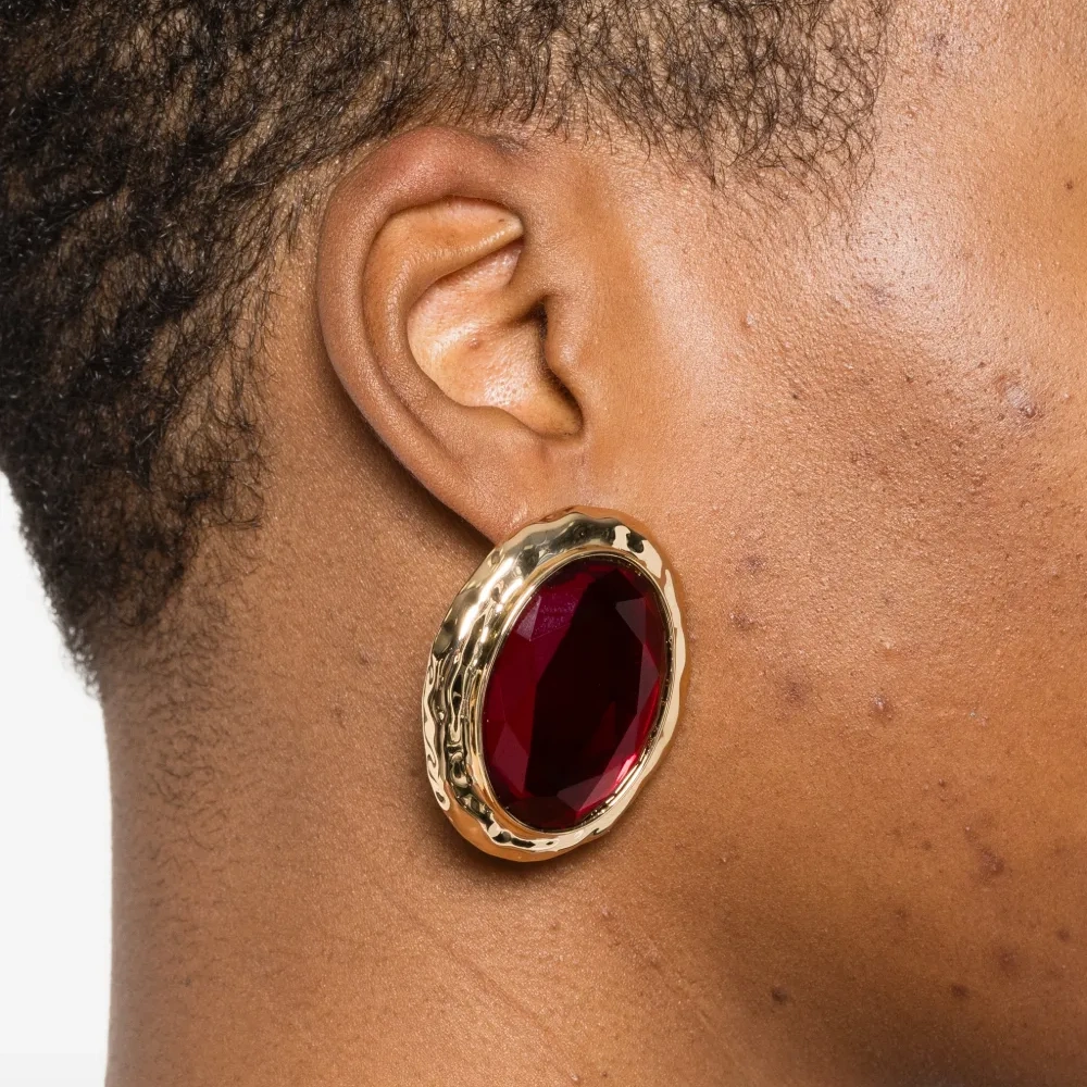 красный и золотистый цвета, эффект чеканки, застежка-гвоздик. Изделие поставляется с защитным мешочком для хранения. Обычное ежедневное использование и воздействие внешних факторов могут снизить блеск драгоценных камней и золотых поверхностей. Для ухода используйте специальные неабразивные средства, предназначенные для чистки украшений. Эти серьги продаются парой.