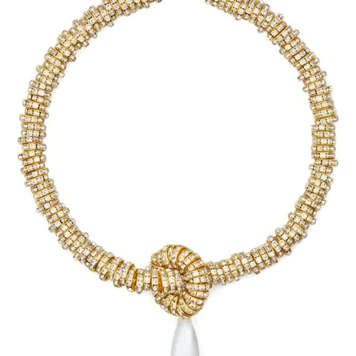 золотистый и светло-бежевый жемчужный подвес с узлом, покрытие с эффектом полировки, застежка на магните. Повседневное использование и воздействие внешних факторов могут снизить блеск драгоценных камней и золотых поверхностей. Для ухода используйте специальные неабразивные средства, предназначенные для чистки ювелирных изделий. Жемчуг должен быть последним аксессуаром, который вы надеваете утром, и первым, который снимаете вечером. Избегайте контакта с духами или кремами, а для очистки просто протирайте мягкой тканью.