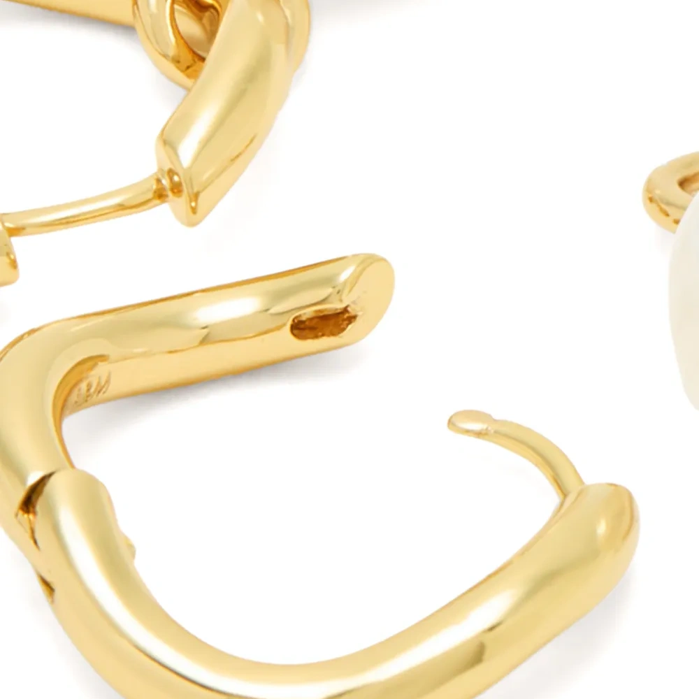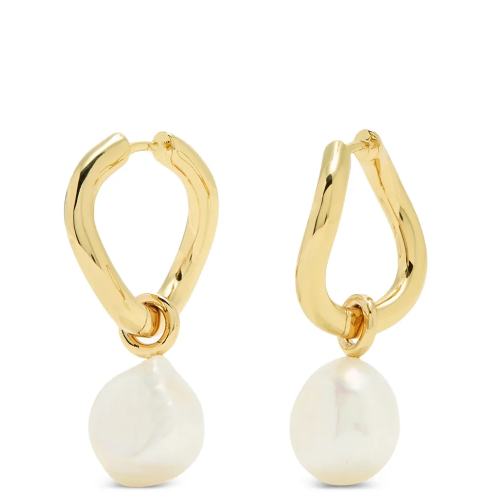 серьги золотистого оттенка с декоративным кольцом, украшением из жемчуга и застёжкой-шарниром. Продаются в паре.