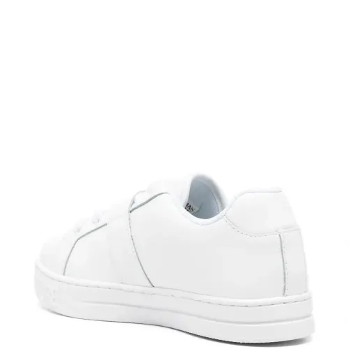 белые, шнуровка спереди, логотип в виде надписи, ремешок с застежкой-пряжкой, круглый носок