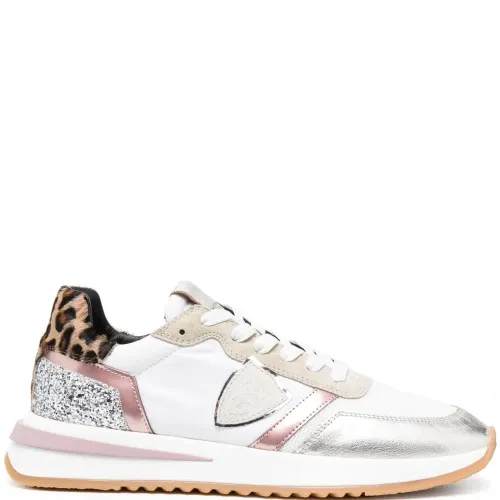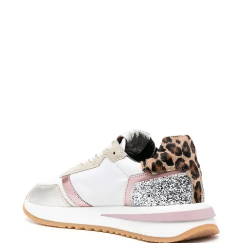 Белый, серебристый, разноцветный, телячья кожа, покрытие с эффектом металлик, блестящий материал, сетка, нашивка с логотипом сбоку, нашивка с логотипом на язычке, миндалевидный носок, шнуровка спереди, высота по щиколотку и плоская резиновая подошва.