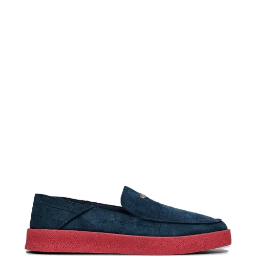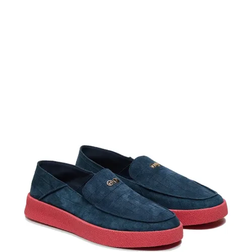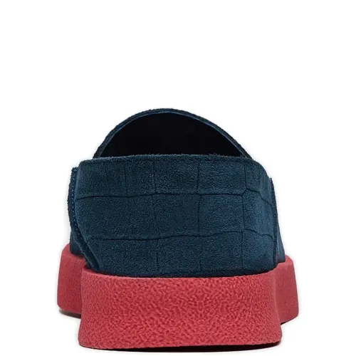 синий с тиснением под крокодила, модель без застежки, плоская подошва, круглый мыс, декор в виде золотистой таблички с логотипом