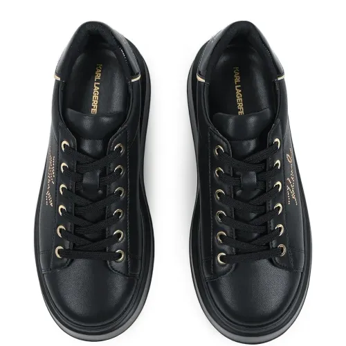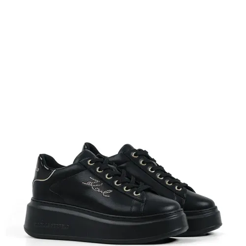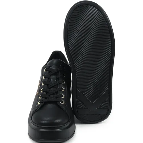черные кроссовки на платформе с декоративной отделкой логотипом, шнуровкой, фурнитурой золотистого цвета и логотипом на пятке
