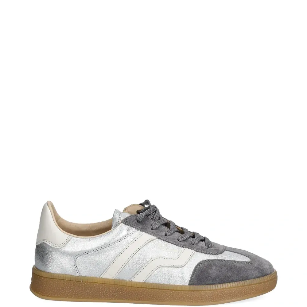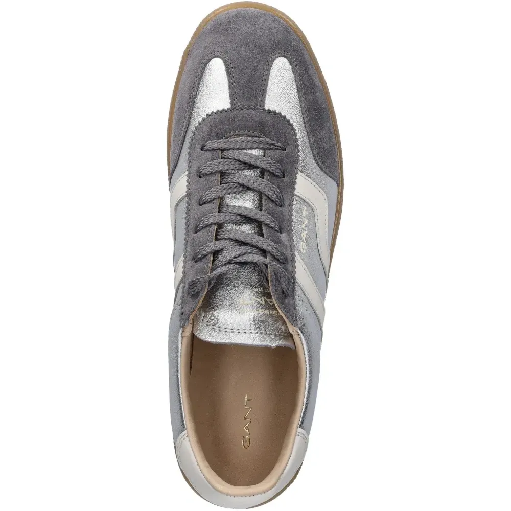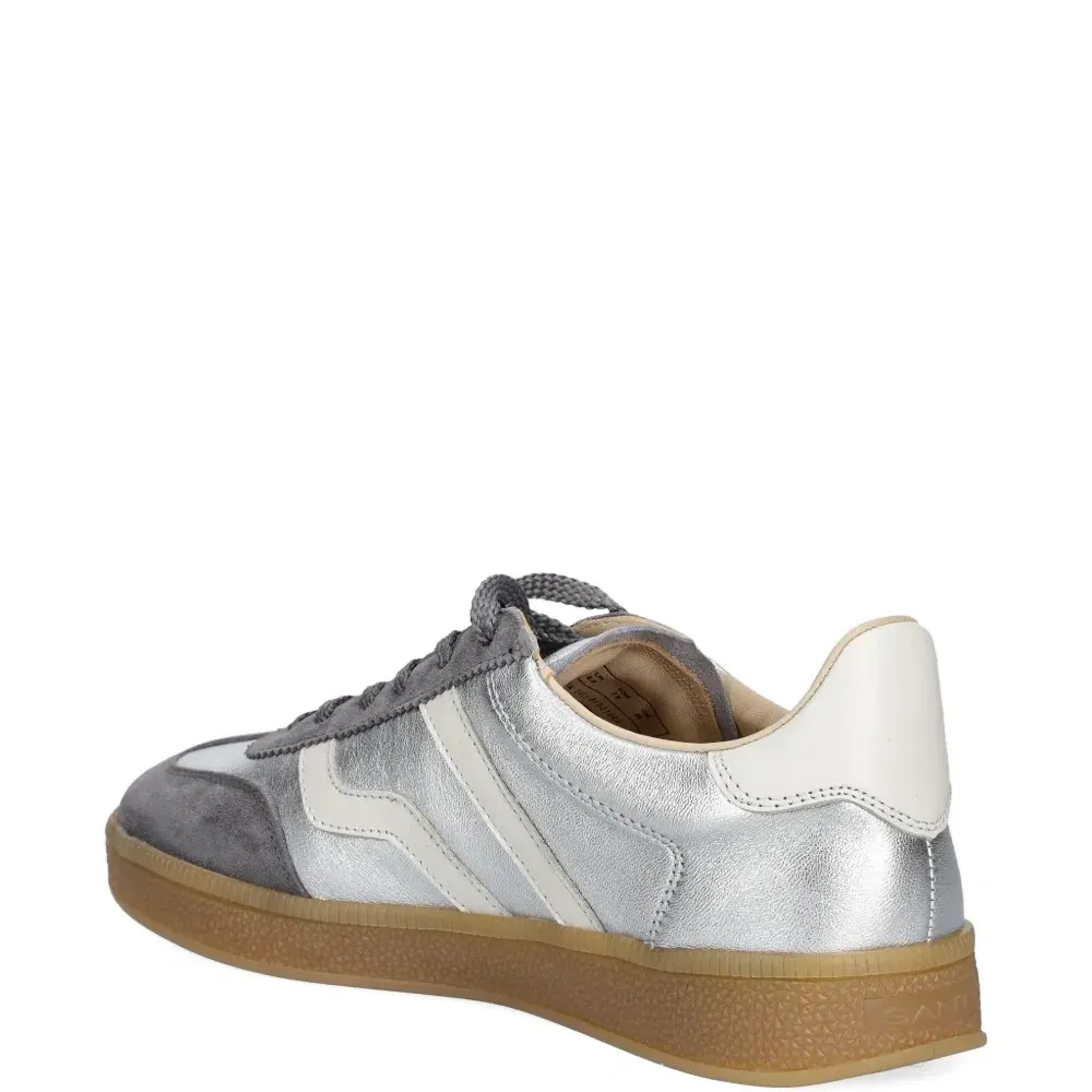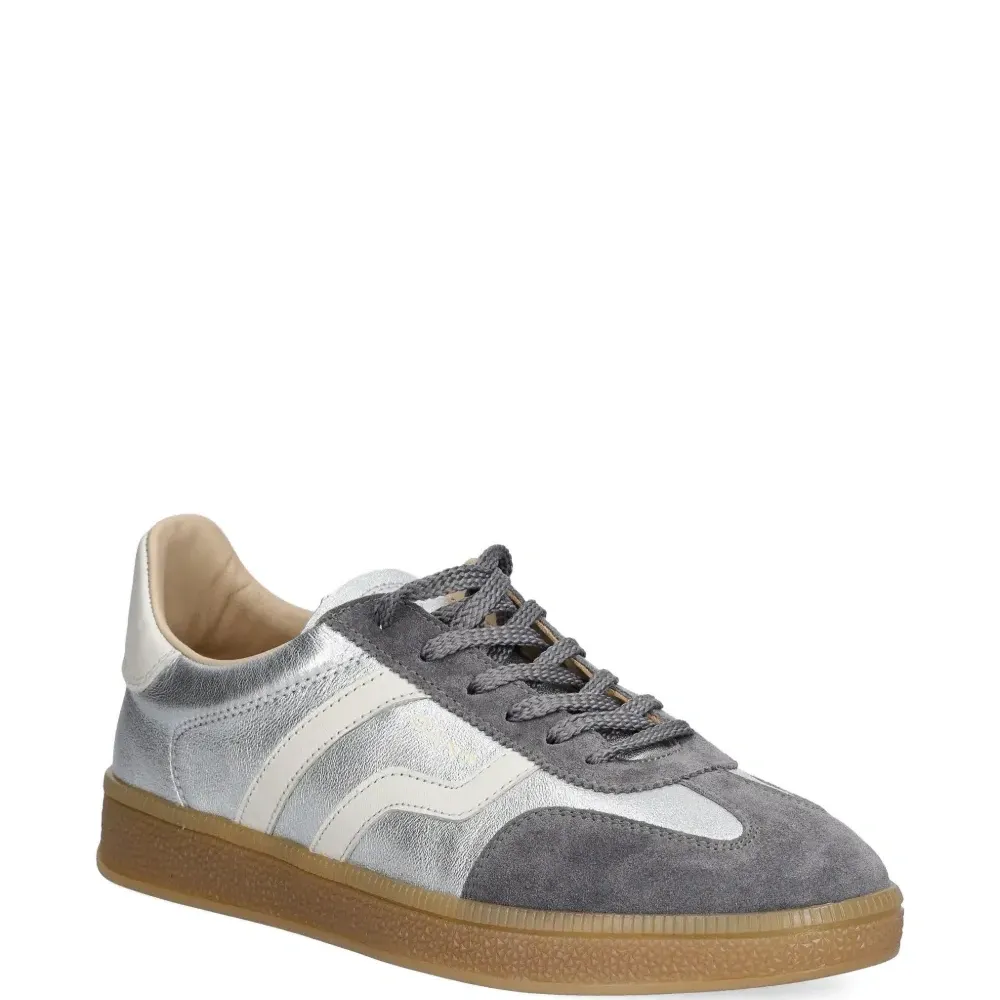 серебристый оттенок, полосатая отделка, шнуровка, круглый нос, резиновая подошва