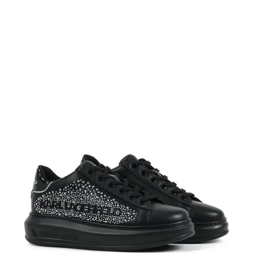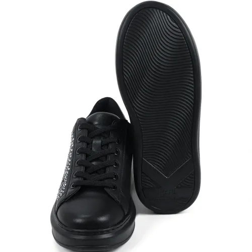 черные украшения стразами, шнуровка, тиснённый логотип, тональная строчка, платформа