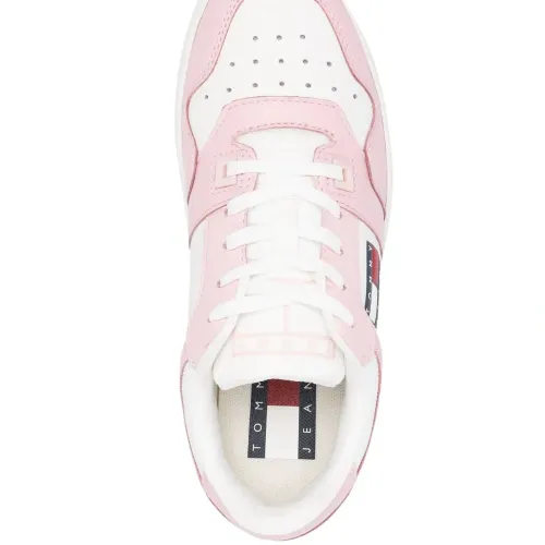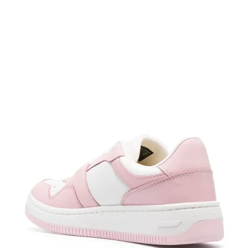 Светло-розовый, серовато-белый, телячья кожа, стиль колор-блок, тисненый логотип сбоку, перфорация, закругленный носок, шнуровка спереди и массивная резиновая подошва.