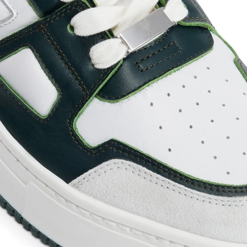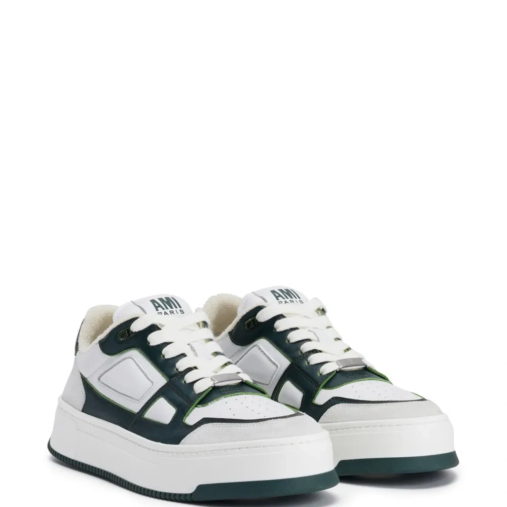Белый, темно-зеленый, кожа, нашивка с логотипом на язычке, вставки, перфорация, стелька с логотипом, закругленный носок, шнуровка спереди и плоская резиновая подошва.