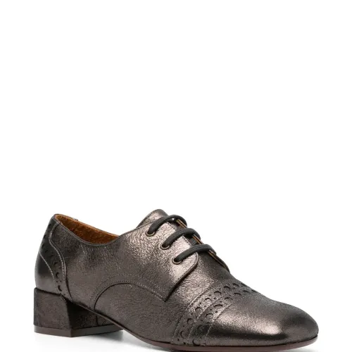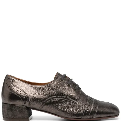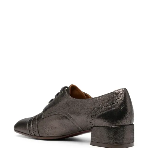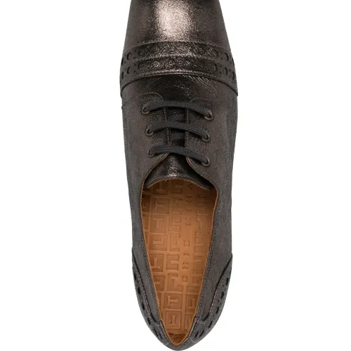 Серый металлик, телячья кожа, эффект металлик, перфорация, строчка в тон, квадратный носок, шнуровка спереди, кожаная стелька с логотипом, низкий блочный каблук и резиновая подошва.