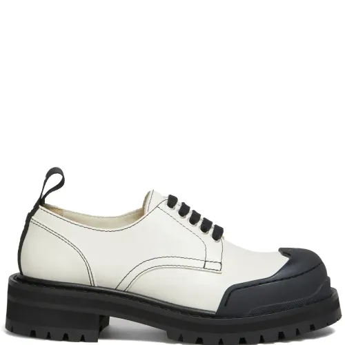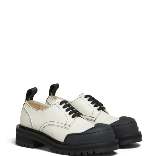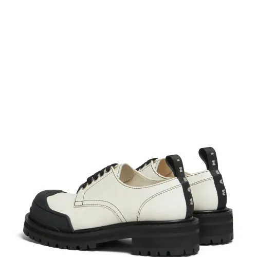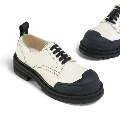 Белый/черный, телячья кожа, контрастная строчка, петля для подтягивания с логотипом, шнуровка спереди, закругленный носок, массивная резиновая подошва c протектором и низкий блочный каблук.