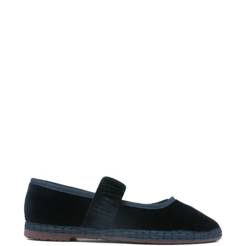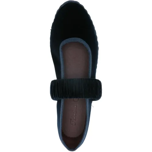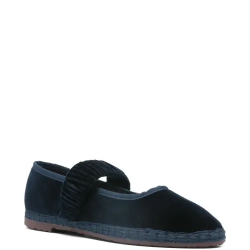 темно-синие балетки с оборками на ремешке и плоской подошвой. В комплекте защитный мешочек для хранения.