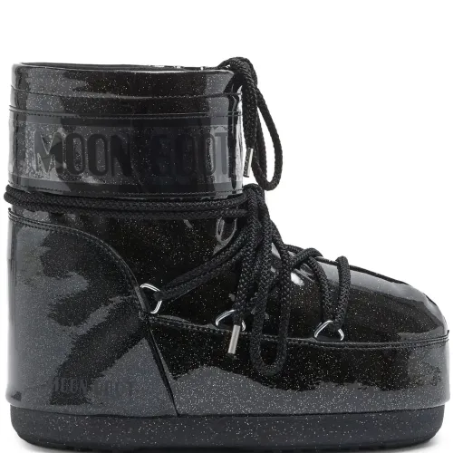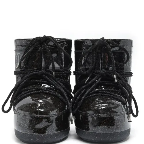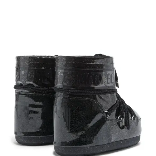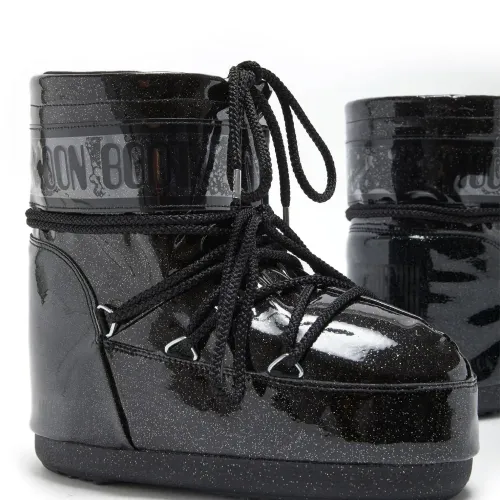 Черный, блестящий материал, водоотталкивающий материал, дутый материал, ремешки с логотипом, отделка металлическими люверсами, цельная подкладка, верхняя застежка на шнурке, шнуровка спереди, закругленный носок, высота по щиколотку, плоская резиновая подошва и модель без застежки.