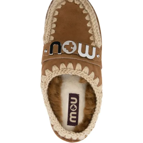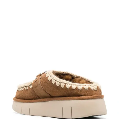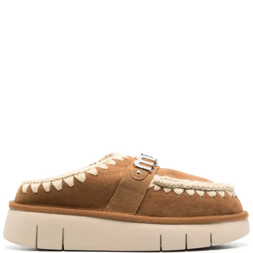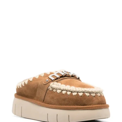 Бежево-коричневый, телячья кожа, серебристый металлический логотип, закругленный носок, модель без застежки и массивная резиновая подошва.