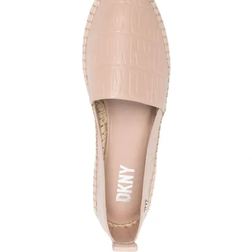 Песочно-коричневый, узор с изображением монограммы, закругленный носок, стелька с логотипом и плетеная подошва из рафии.
