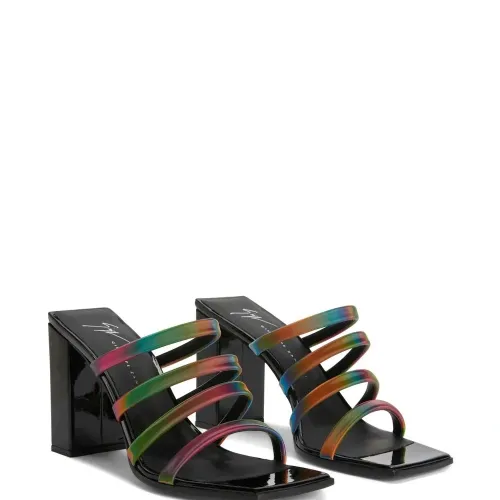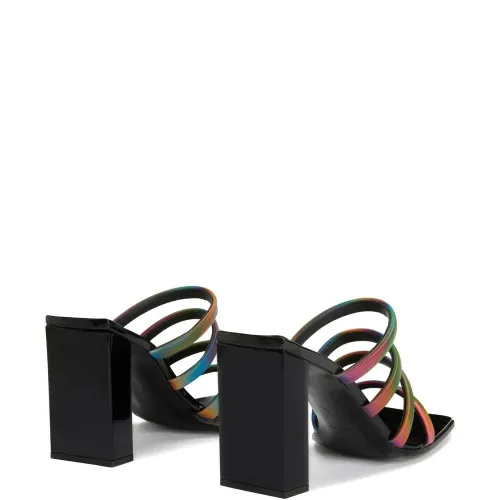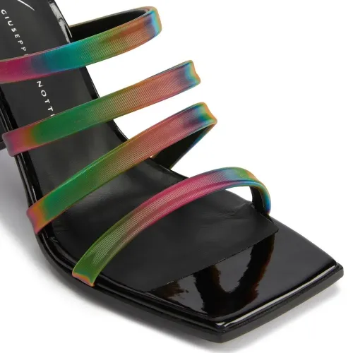 Черный/разноцветный, кожа, ремешки, покрытие с переливающимся эффектом, открытый носок, модель без застежки, кожаная стелька с логотипом и высокий блочный каблук.