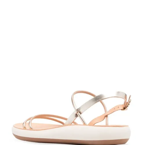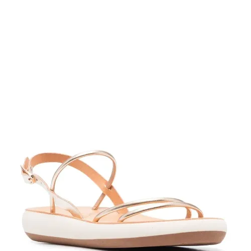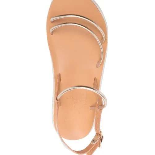 Золотистый, телячья кожа, открытый носок, ремешок на щиколотке с пряжкой и плоская подошва.