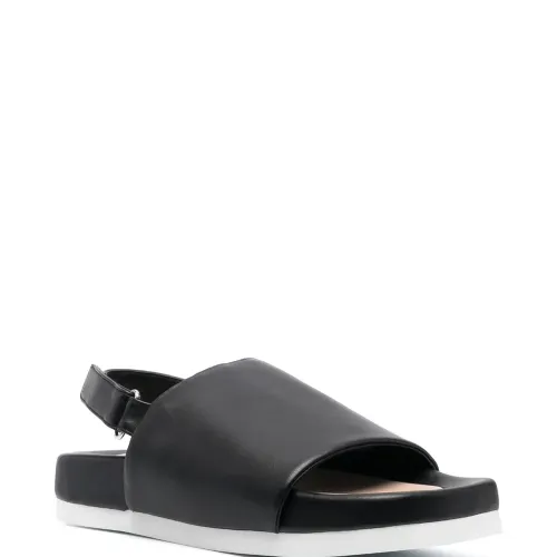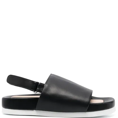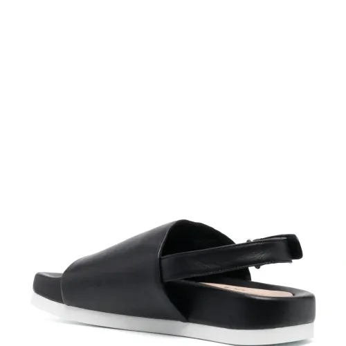 Черный, овечья кожа, телячья кожа, гладкая текстура кожи, открытый носок, застежка на липучке сзади, ремешок на палец, кожаная стелька с логотипом и плоская платформа.