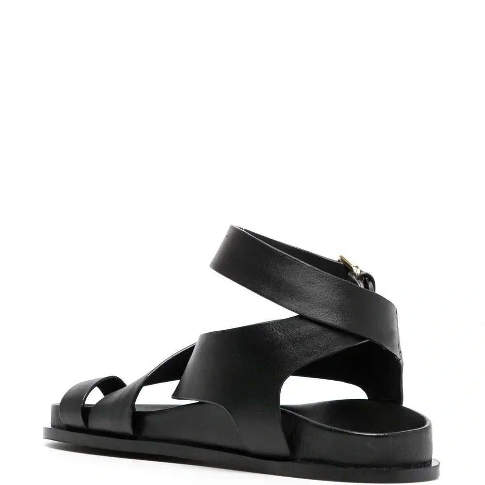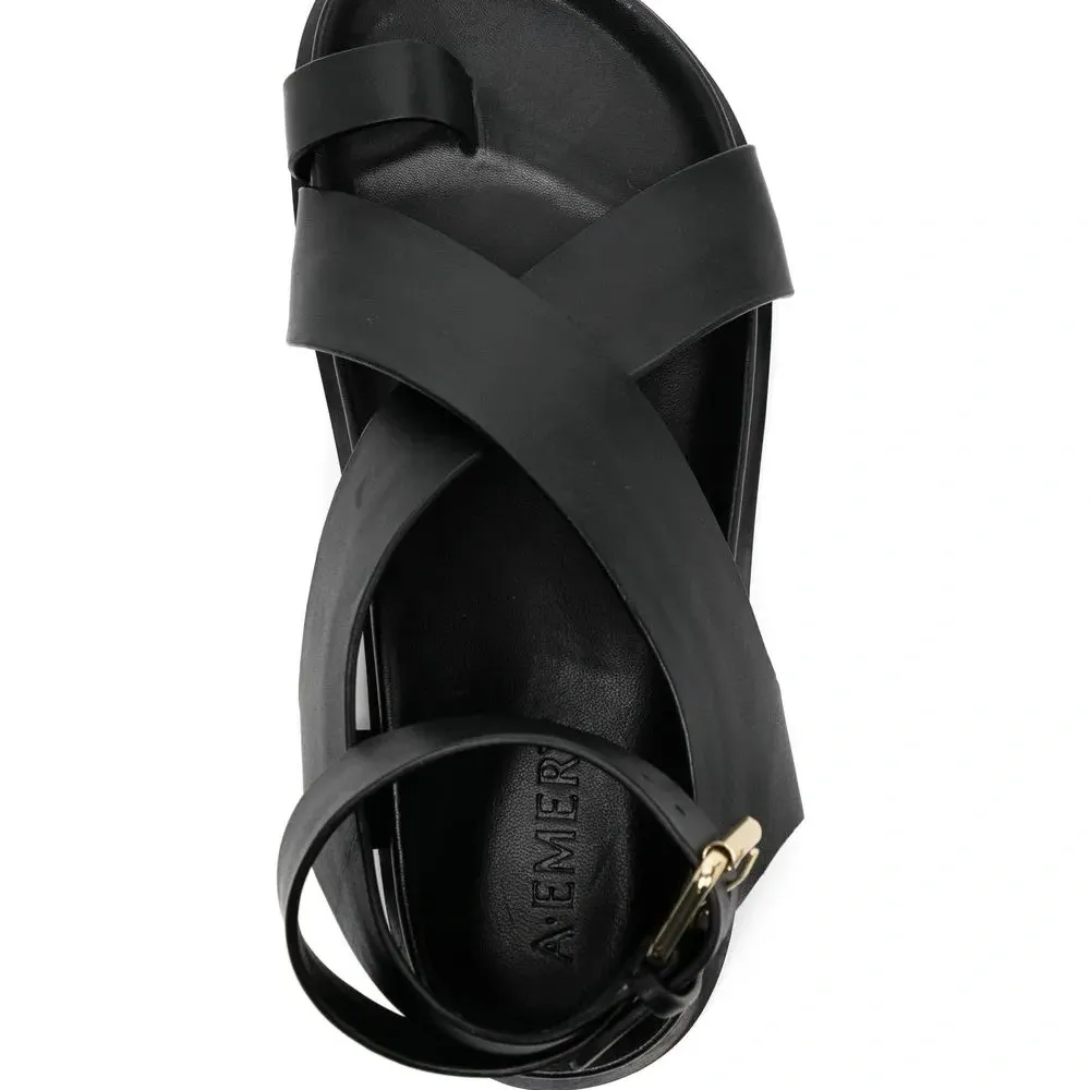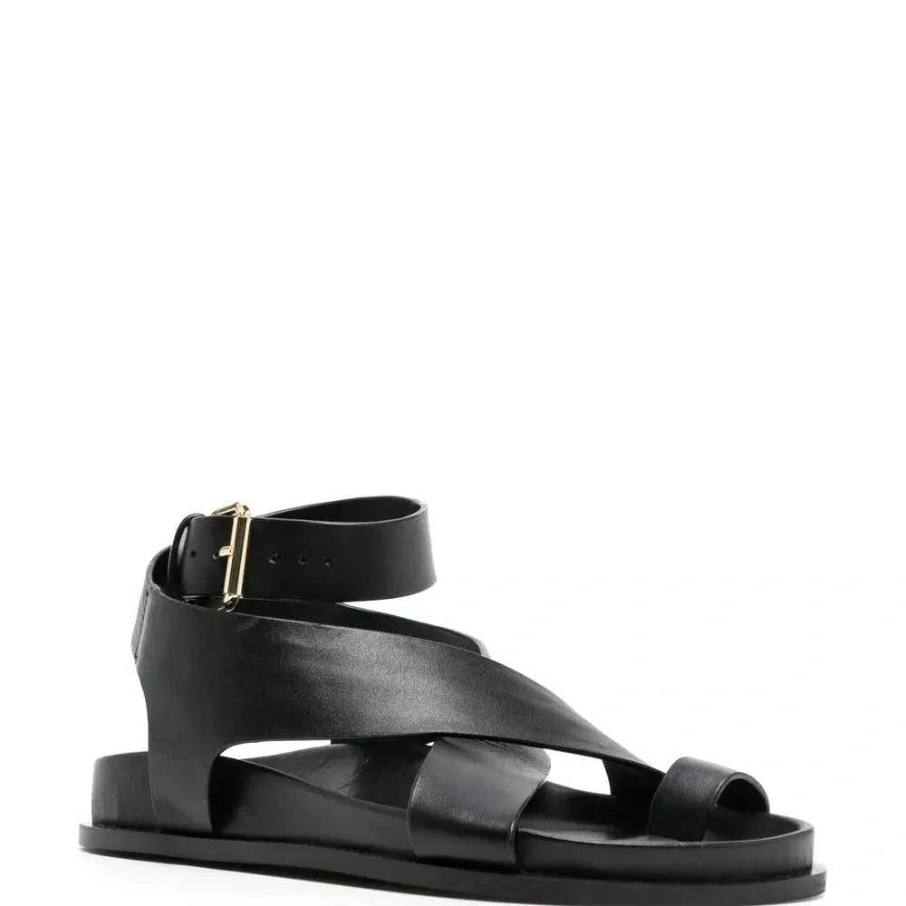 Черный, телячья кожа, стелька с логотипом, ремешок на палец, ремешок на щиколотке с пряжкой и плоская подошва.