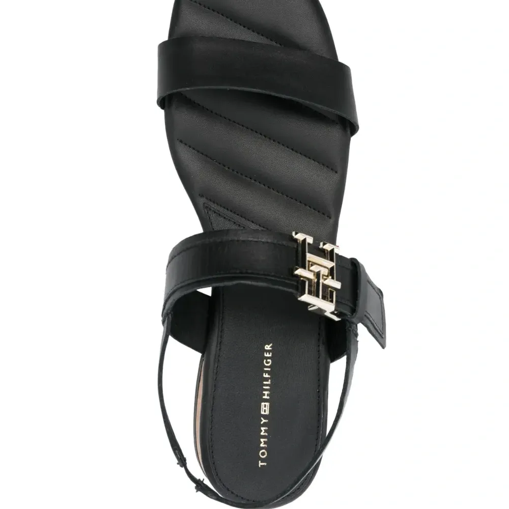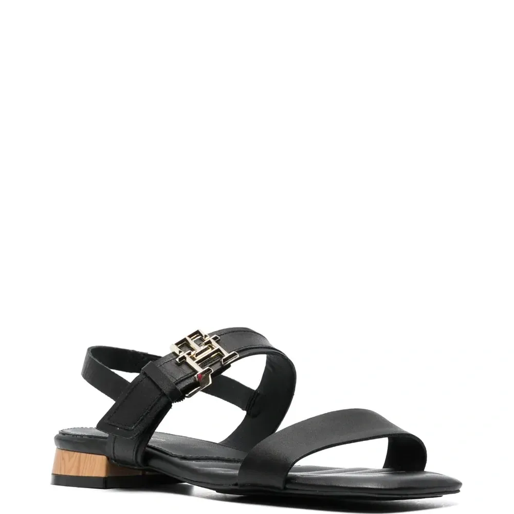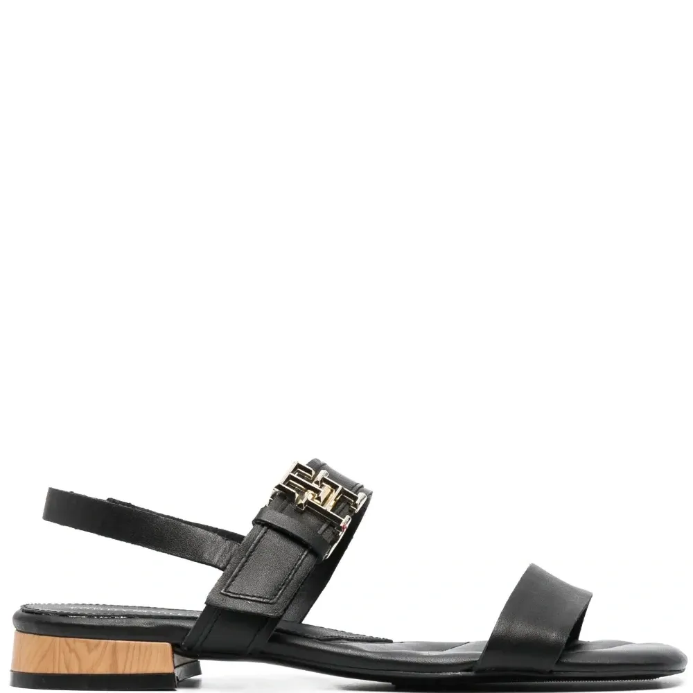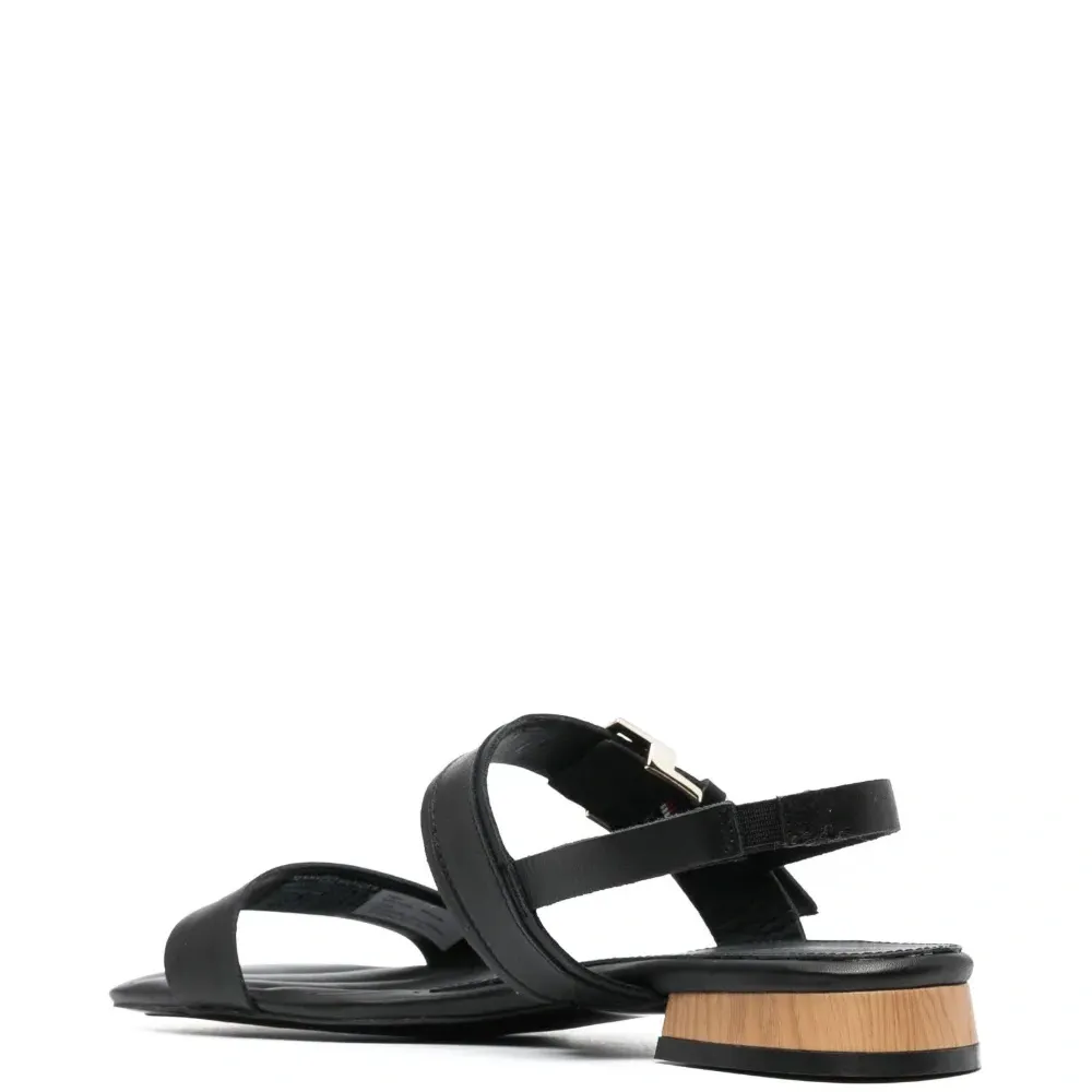 Черный, телячья кожа, зернистая текстура, ремешок на пятке, браслет в два оборота, стелька с логотипом, открытый носок, квадратный носок, застежка на пряжке с логотипом и низкий блочный каблук.