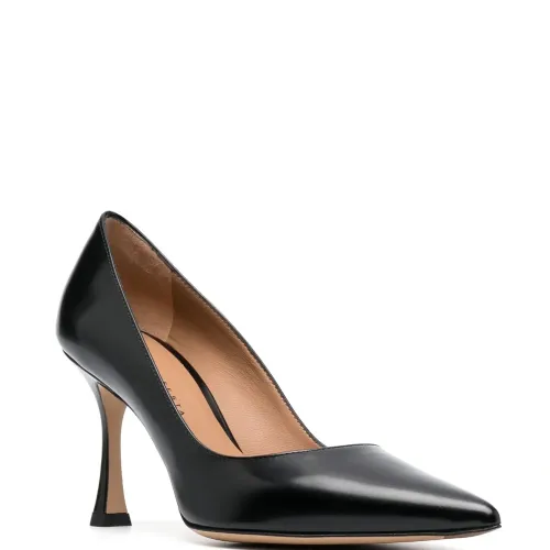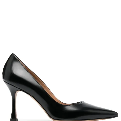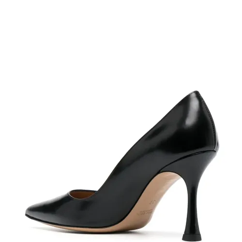 Черный, телячья кожа, гладкая текстура кожи, стелька с логотипом, заостренный носок, модель без застежки и высокий скульптурный каблук.