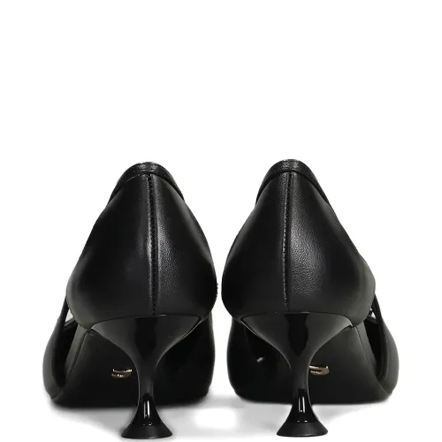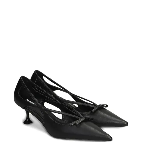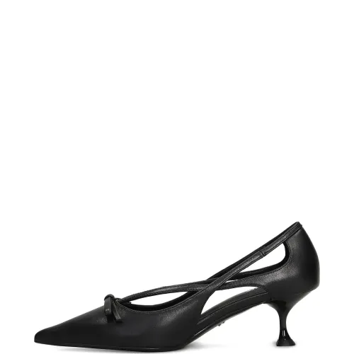 черные туфли с заострённым мыском, вырезами, на каблуке-шпильке, с бантом и глянцевым каблуком