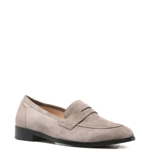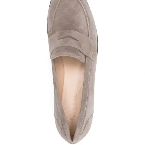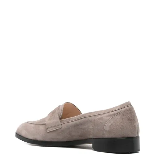 верх из серой замши, деталь с перемычкой (пенни), низкий квадратный каблук, заострённый носок, стиль без застёжки