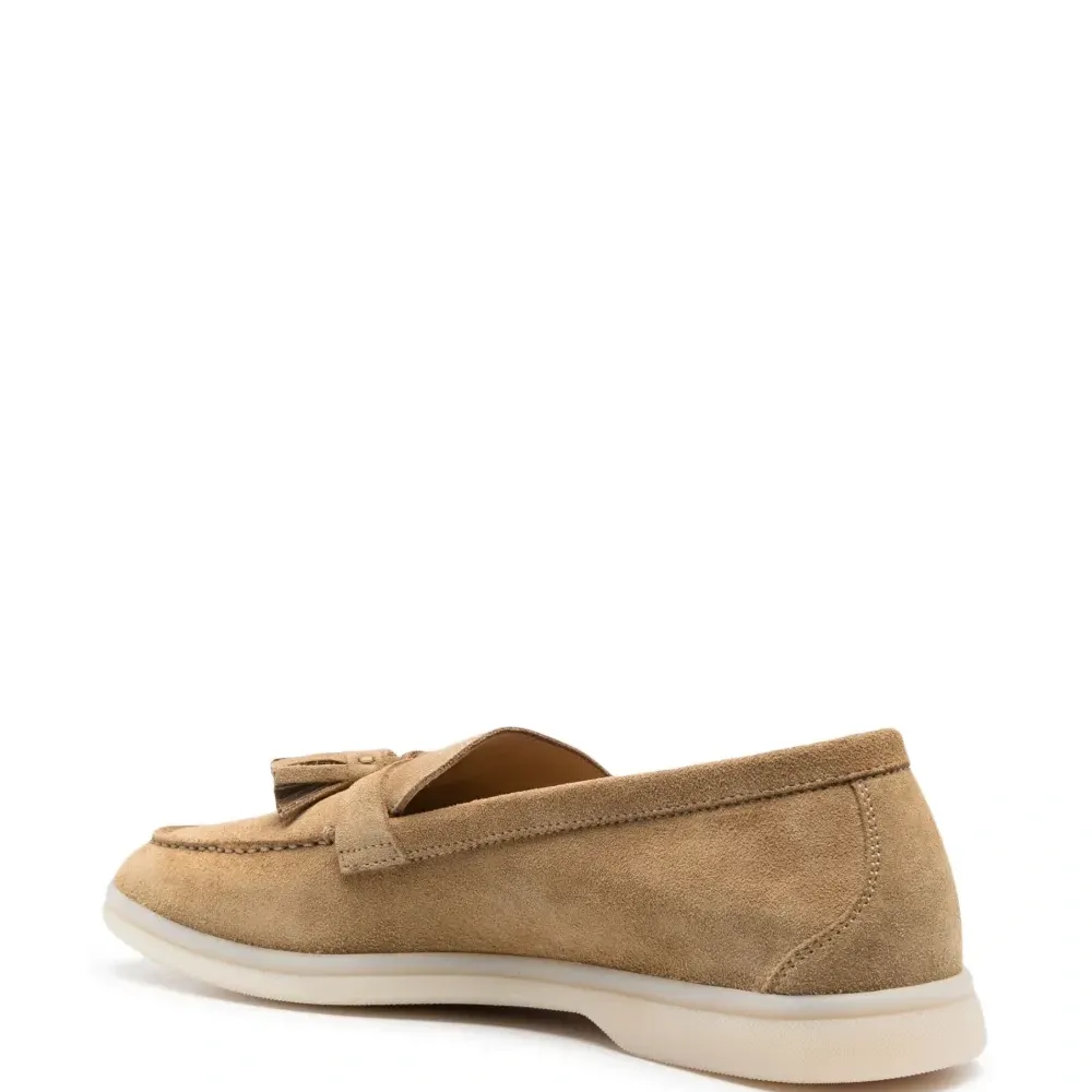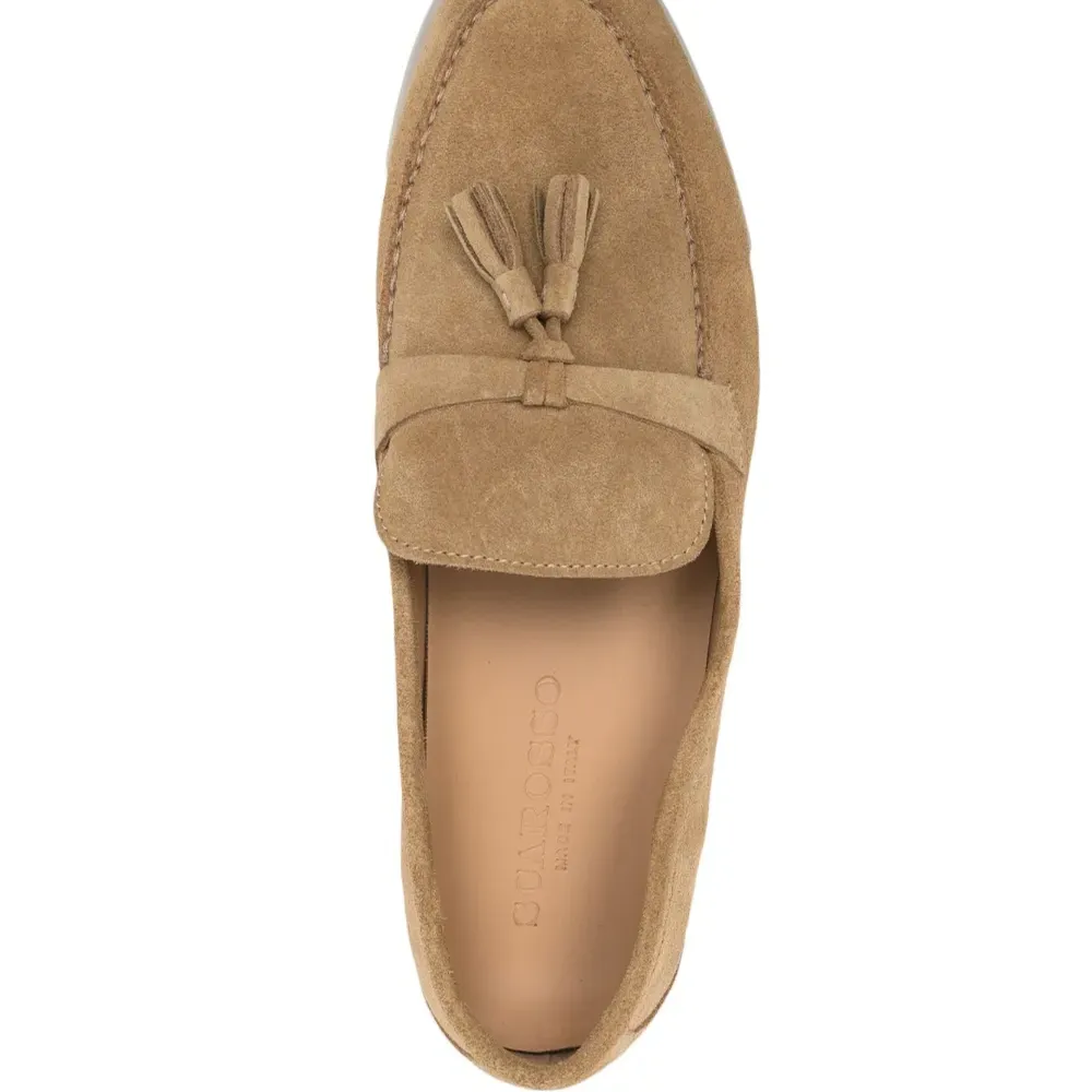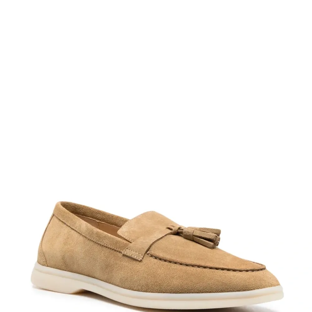 Бежевый, замша из телячьей кожи, декоративные кисточки, строчка в тон, миндалевидный носок, кожаная стелька с логотипом и плоская резиновая подошва.
