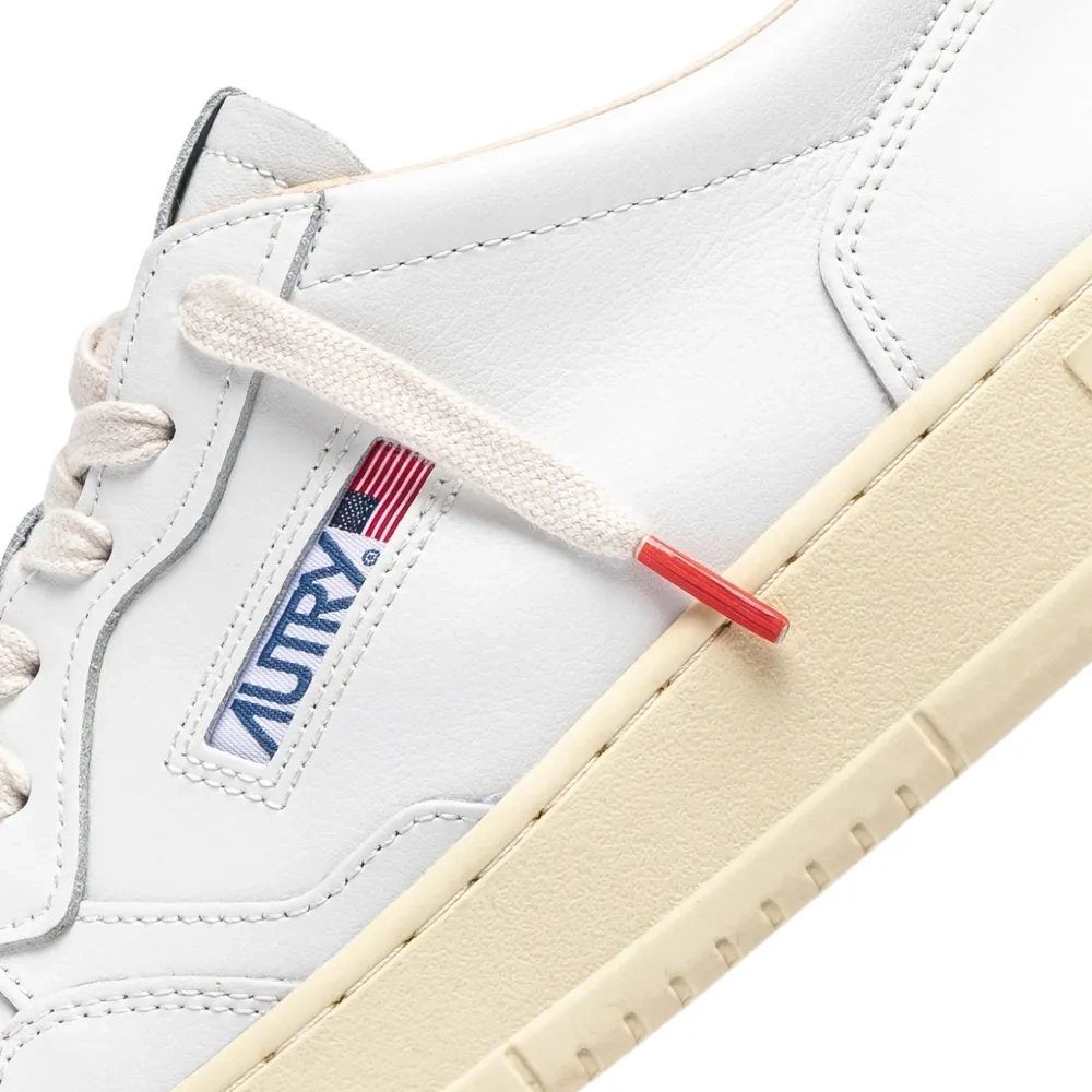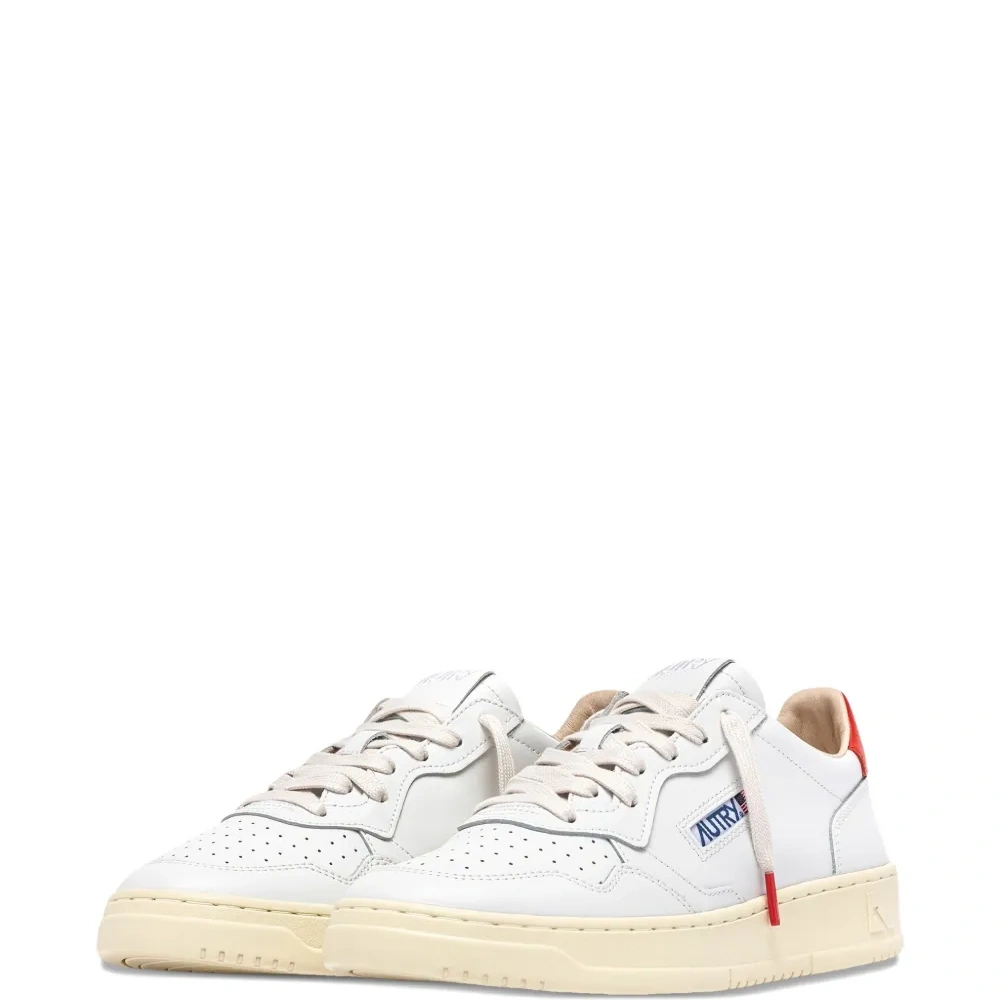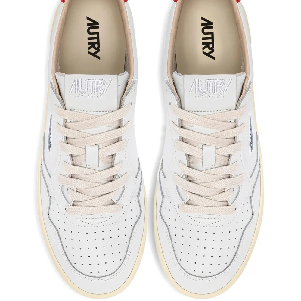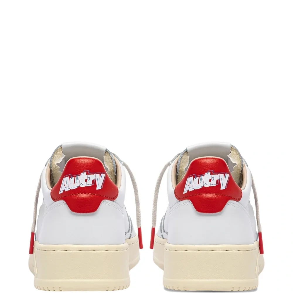 белый цвет, панельный дизайн, принт с логотипом, перфорированные детали, красная задняя вставка на пятке, спереди шнуровка