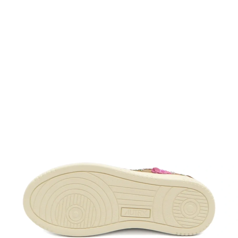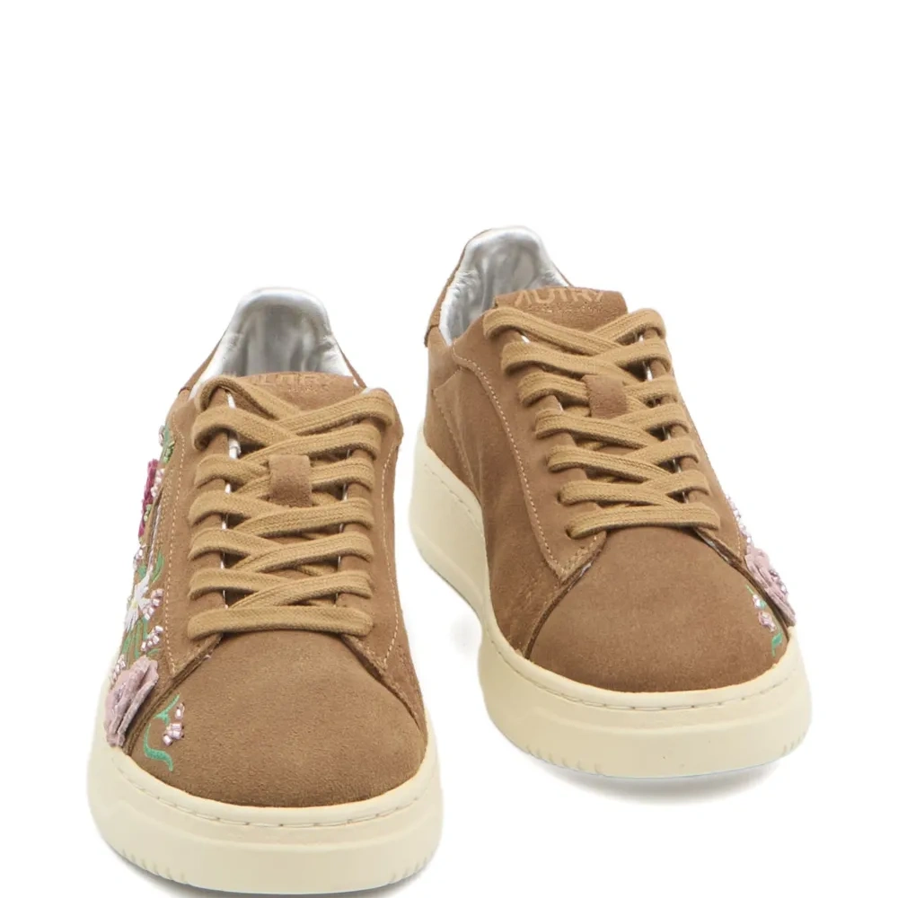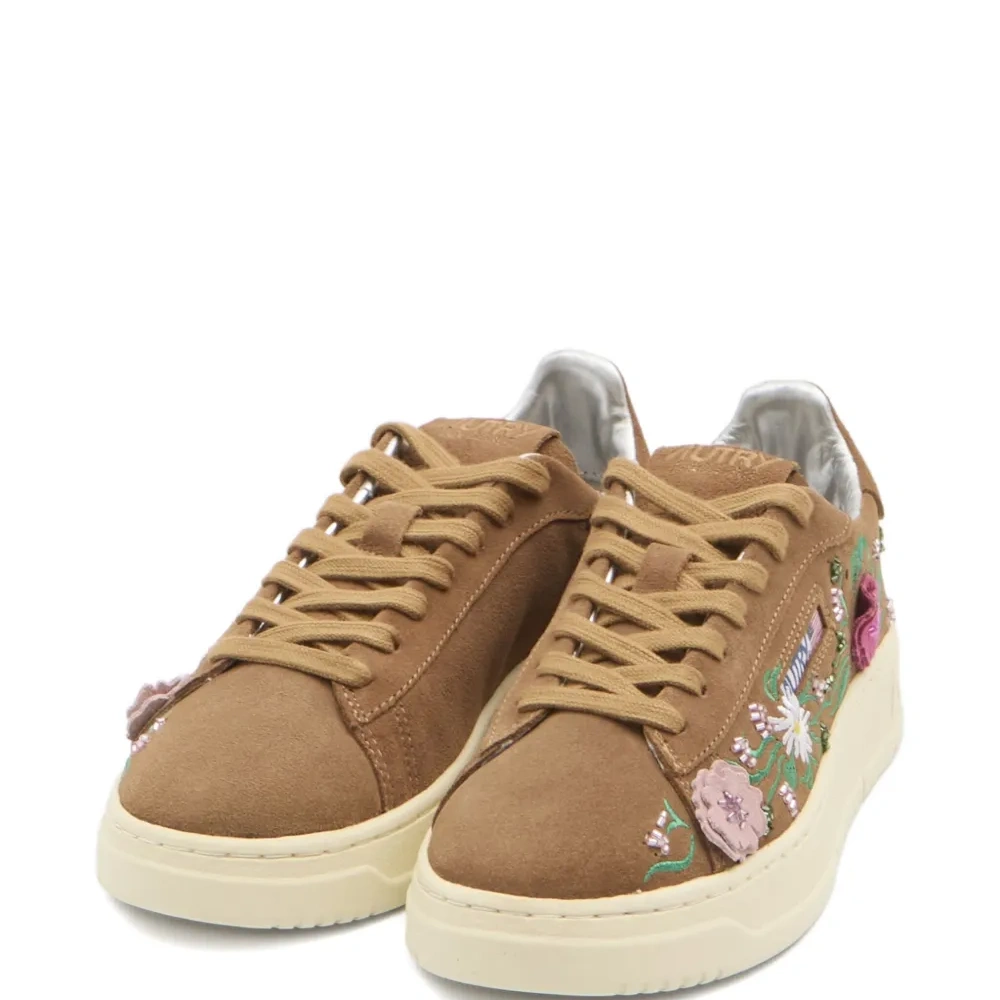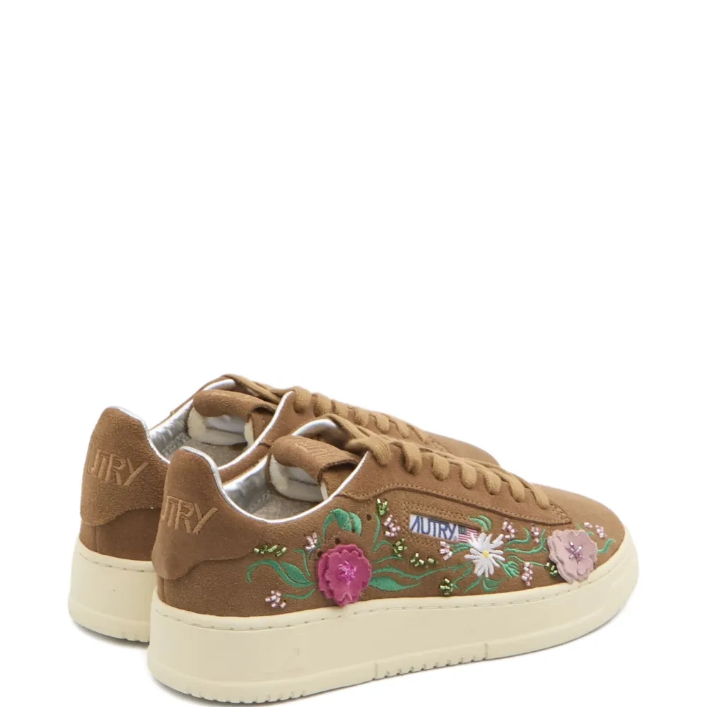 коричневый верх из замши, цветочная вышивка, боковая нашивка с логотипом, круглый носок