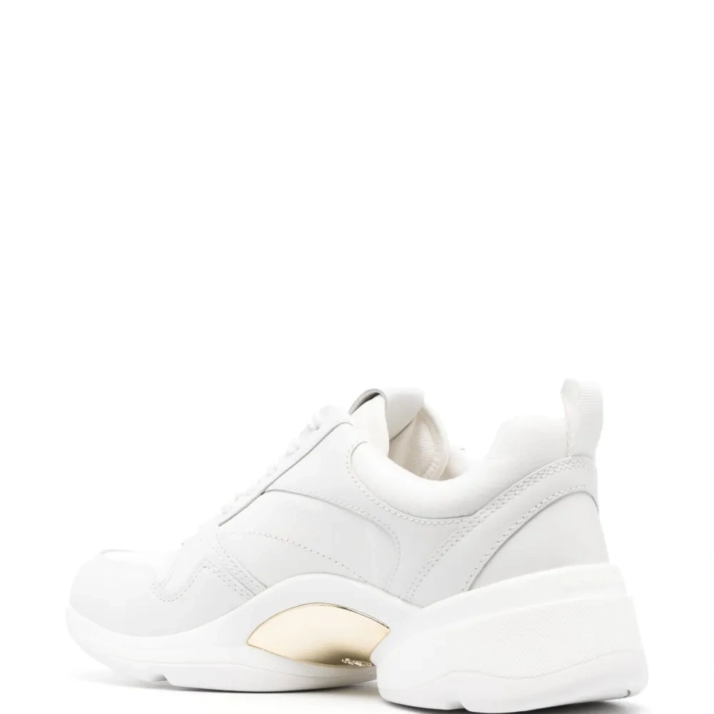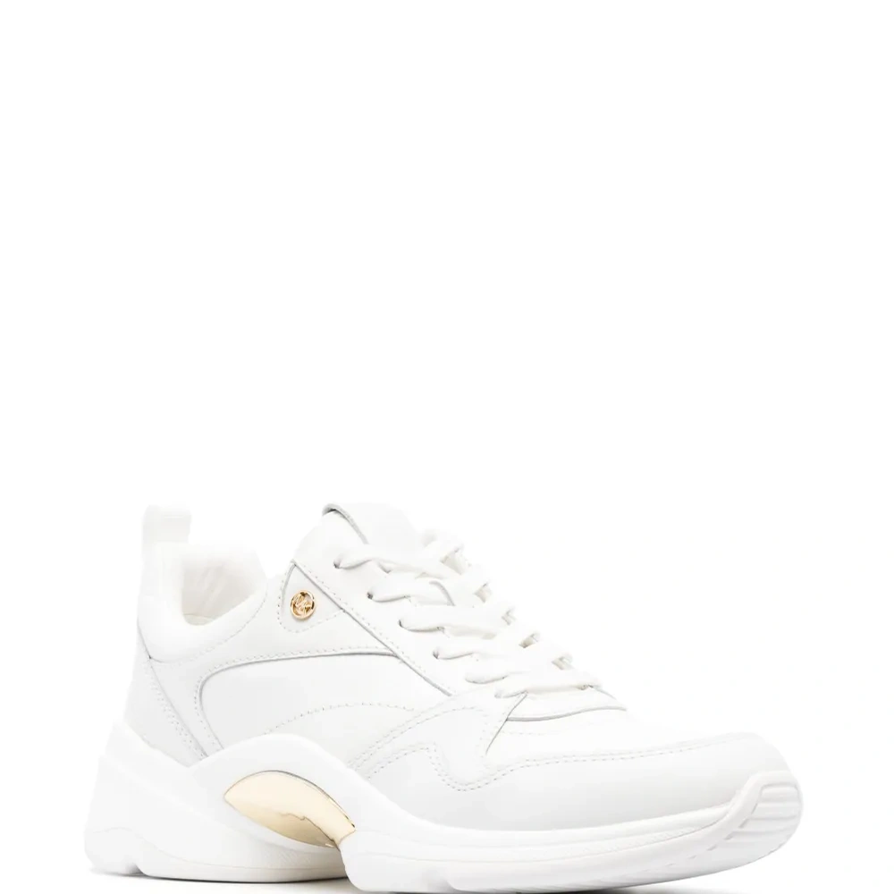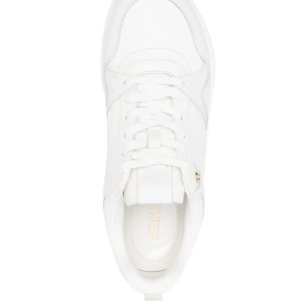 Белый, телячья кожа, нашивка с логотипом на язычке, золотистый металлический логотип, петля для подтягивания сзади, строчка в тон, закругленный носок, кожаная стелька с логотипом и плоская резиновая подошва.
