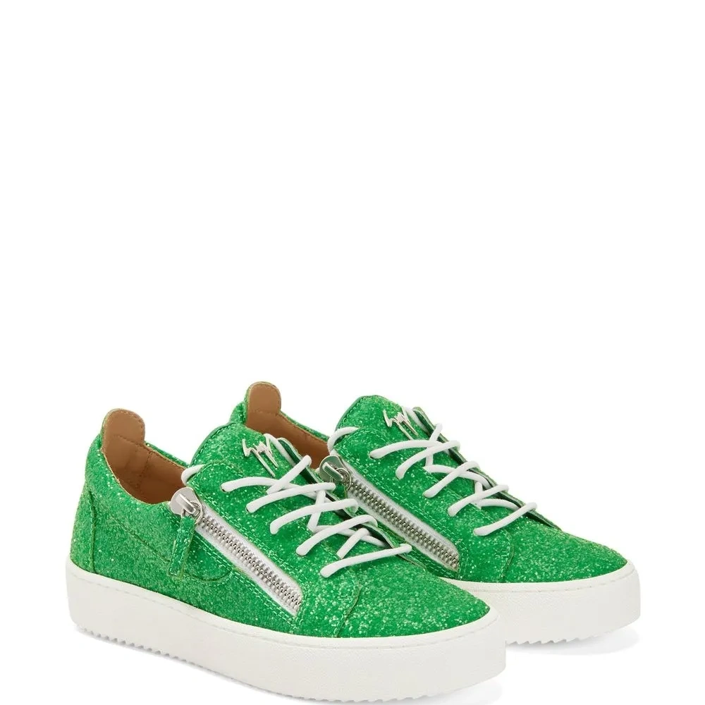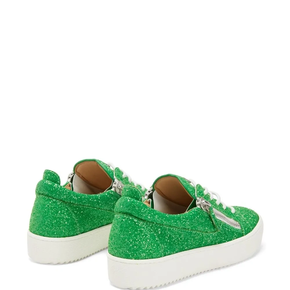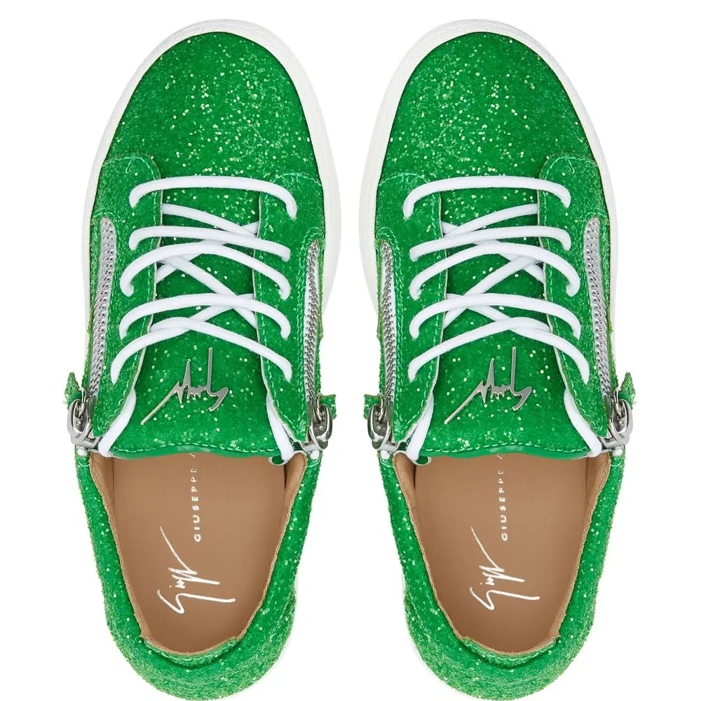 Зеленый, Кожа, блестящий материал, закругленный носок, шнуровка спереди, металлический логотип на язычке, отделка с декоративной молнией и плоская резиновая подошва.