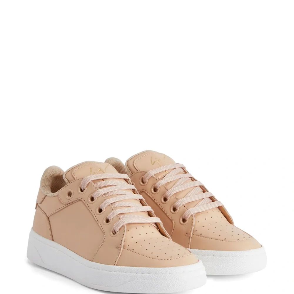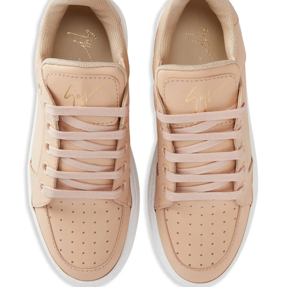 Кораллово-розовый, кожа, язычок с логотипом, перфорация, закругленный носок, шнуровка спереди и контрастная резиновая подошва.