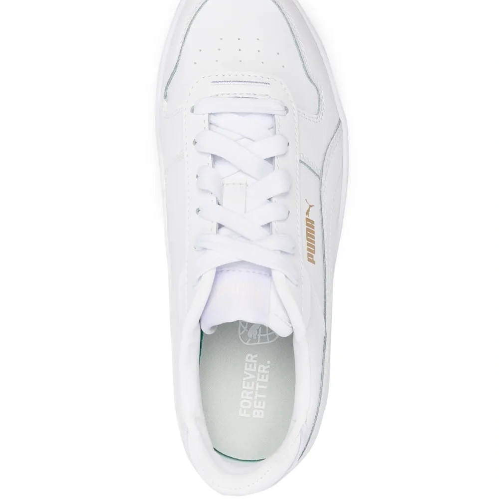 Белый, телячья кожа, перфорация, логотип сбоку, нашивка с логотипом на язычке, логотип на подошве, задник с логотипом, закругленный носок, шнуровка спереди, стелька с логотипом и плоская резиновая подошва.