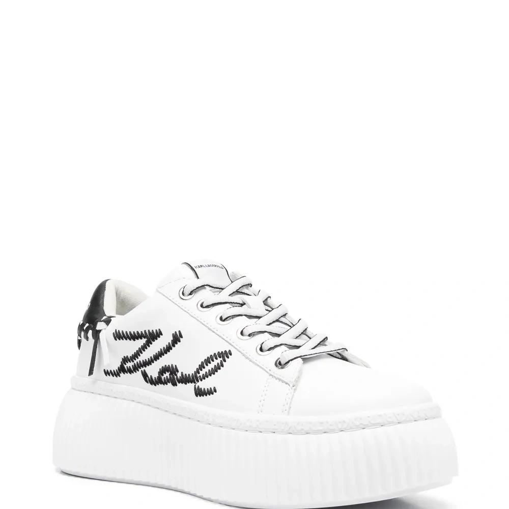 Белый/черный, телячья кожа, вышитый логотип сбоку, нашивка с логотипом на язычке, плетеная отделка, контрастный задник с логотипом, закругленный носок, шнуровка спереди, низкая посадка, стелька с логотипом, подошва на платформе и массивная резиновая подошва.