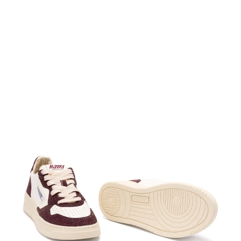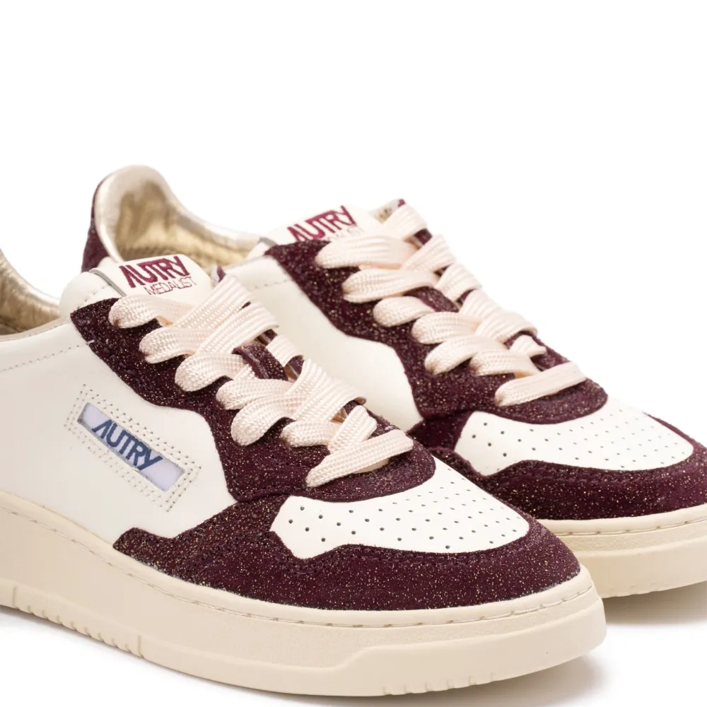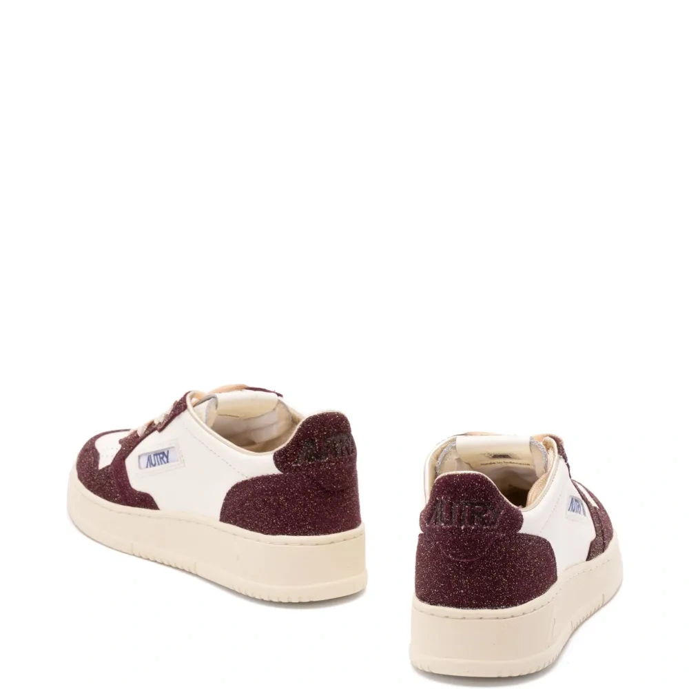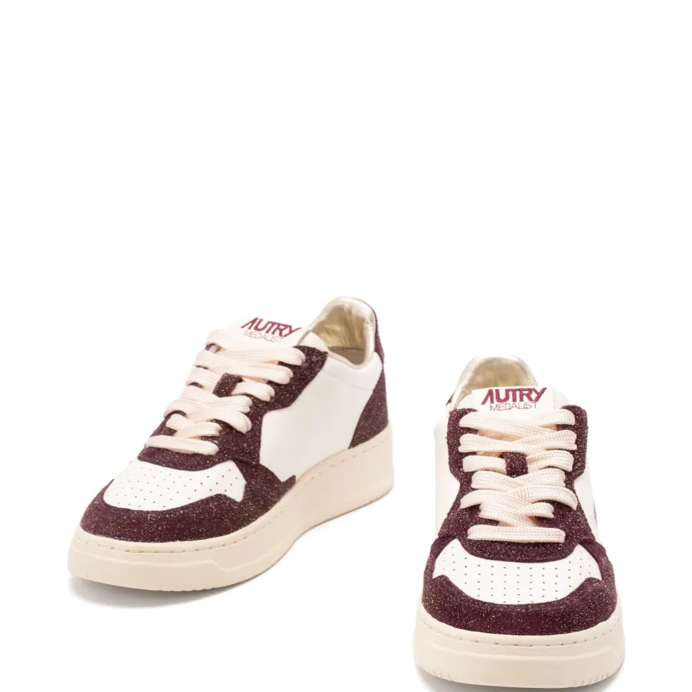 Кеды Medalist Low из белой кожи с коричневыми блестками. Микроперфорированный носок, плоские хлопковые шнурки, вышитая нашивка на язычке, мягкий воротник, подкладка из свиной кожи, махровой ткани и нейлона, кожаная стелька с поднятием на 2 см, резиновая подошва, высота подошвы: 2,5–3,5 см. Персонализированный мешок для обуви из ткани. Состав: 80% кожа козы, 20% замша.