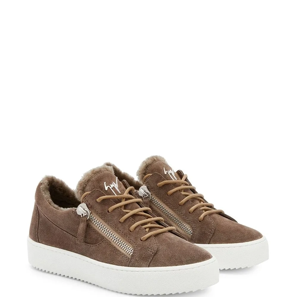 Коричневый, белый, замша, овечья кожа, отделка из овчины, серебристая фурнитура, металлический логотип на язычке, стелька с логотипом, шнуровка спереди, застежки на молнии сбоку, закругленный носок и контрастная резиновая подошва.