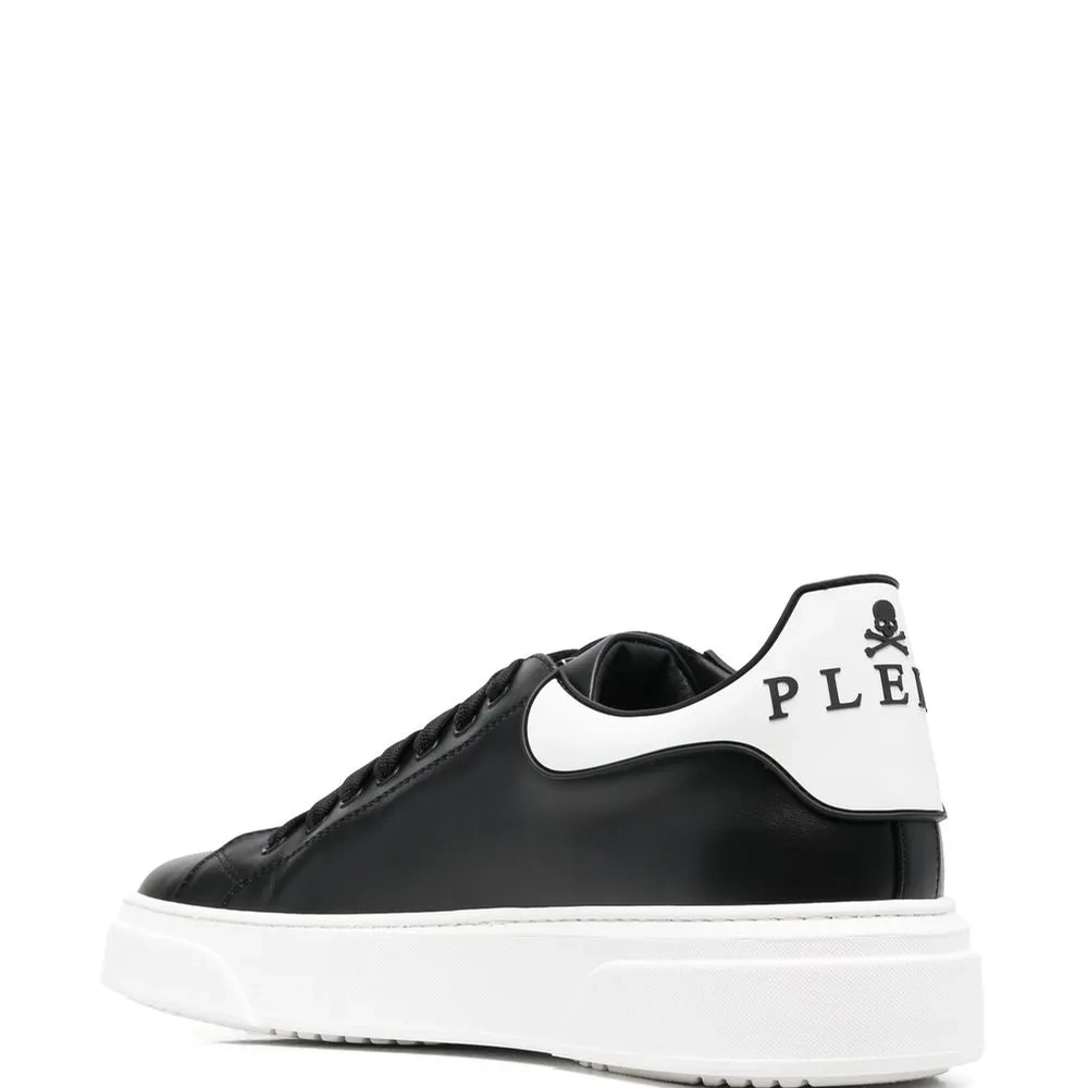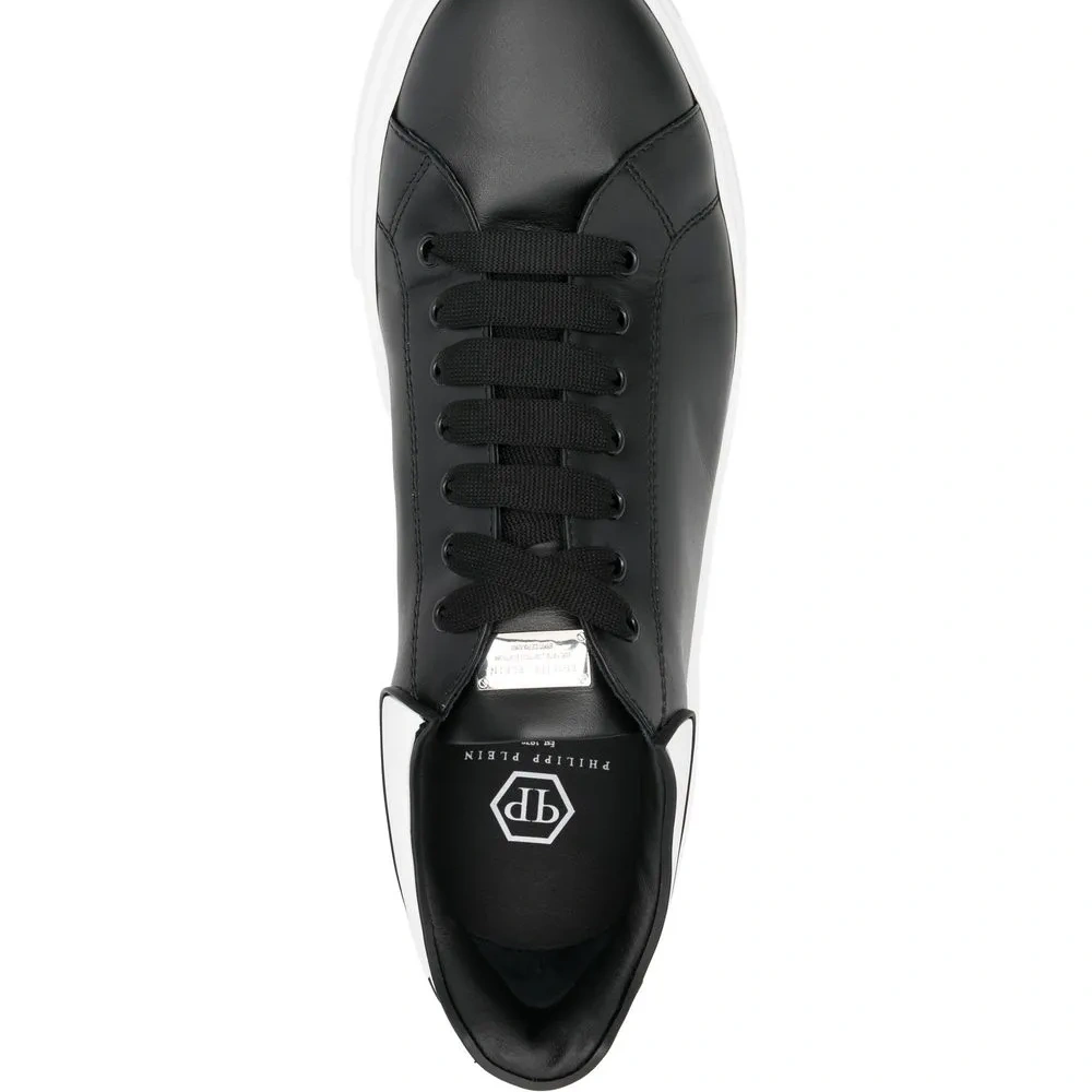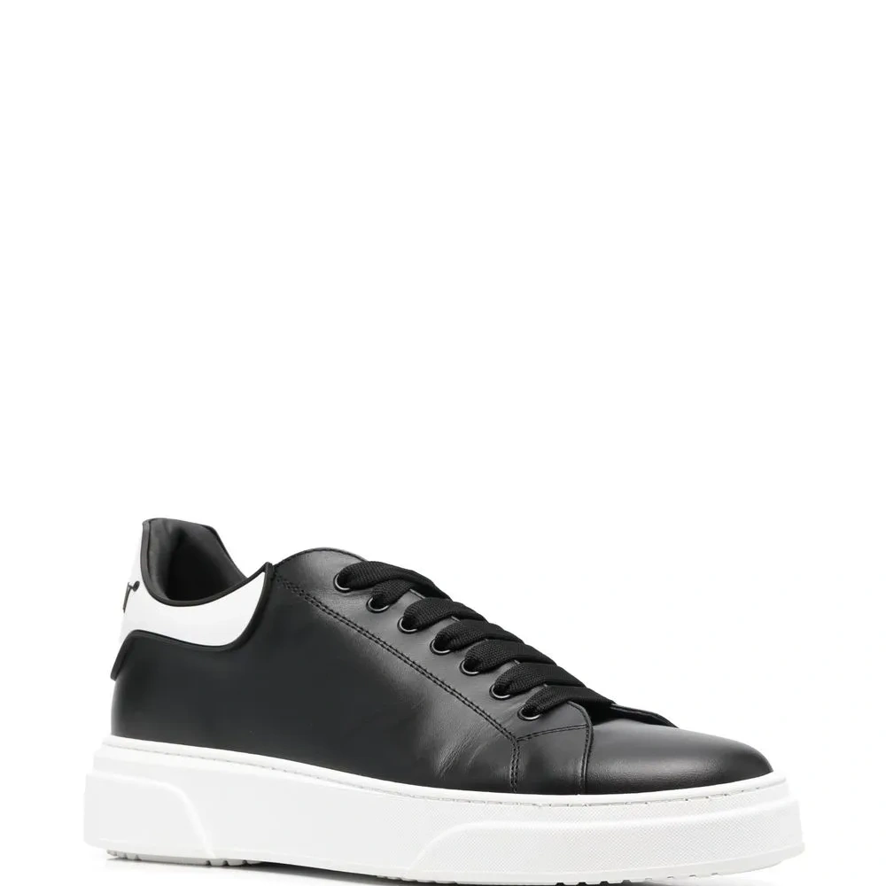 Черный, белый, закругленный носок, шнуровка спереди, нашивка с логотипом на язычке, контрастный задник с логотипом и плоская резиновая подошва.