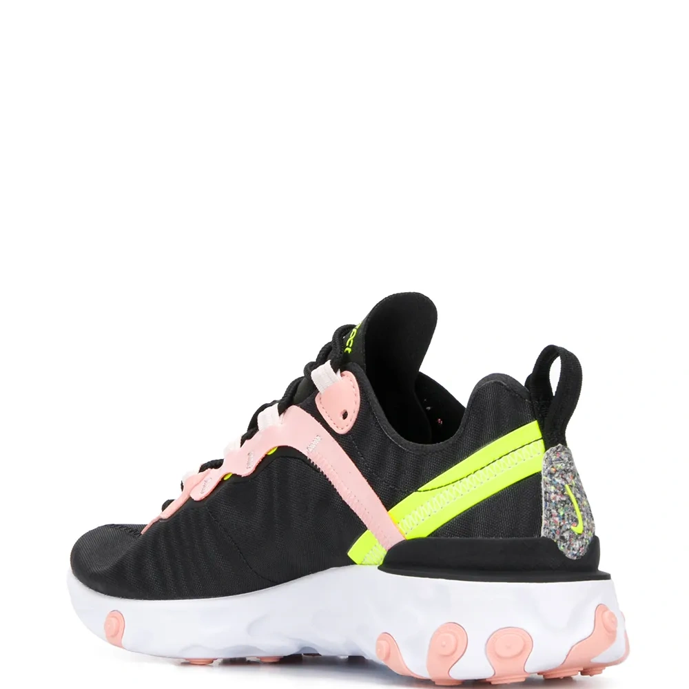 Кроссовки W React Element 55 от Nike (Найки). Фирменная галочка Nike, белая резиновая подошва, кожаные панели, петля для подтягивания сзади, шнуровка спереди и контрастная стойка на каблуке. Цвет: черный.