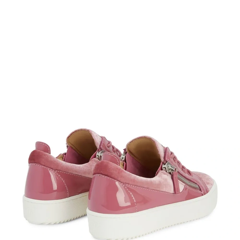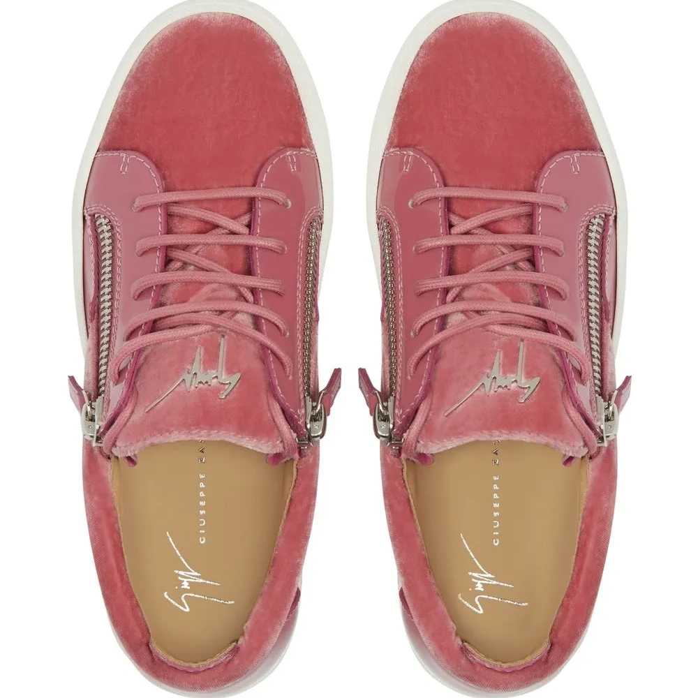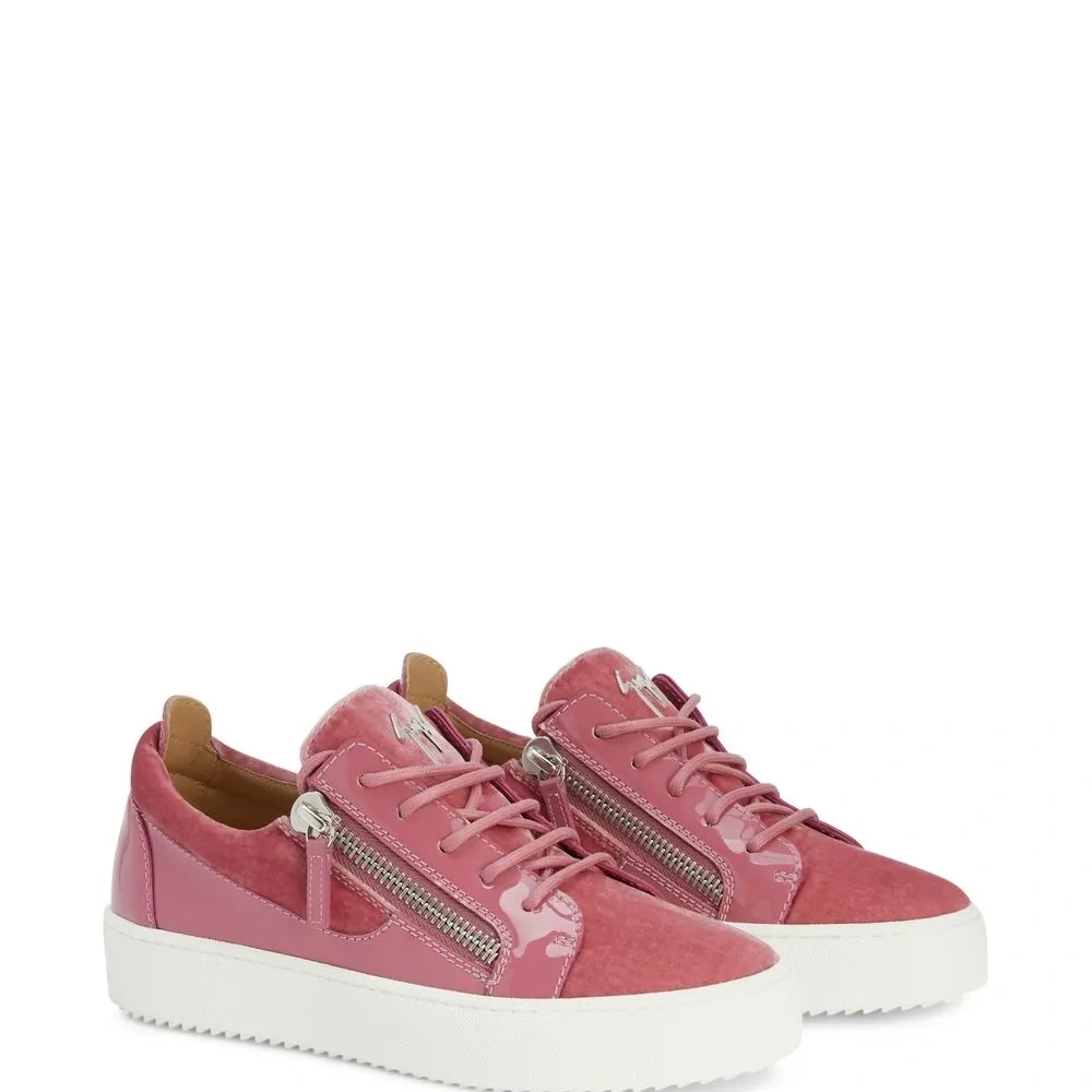 Розовый, кожа, смесовый шелк, бархатный эффект, закругленный носок, шнуровка спереди, металлический логотип на язычке, отделка с декоративной молнией, стелька с логотипом и плоская резиновая подошва.