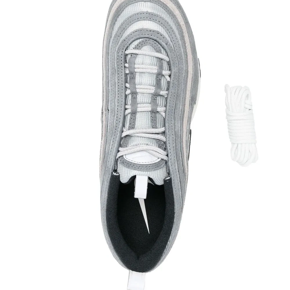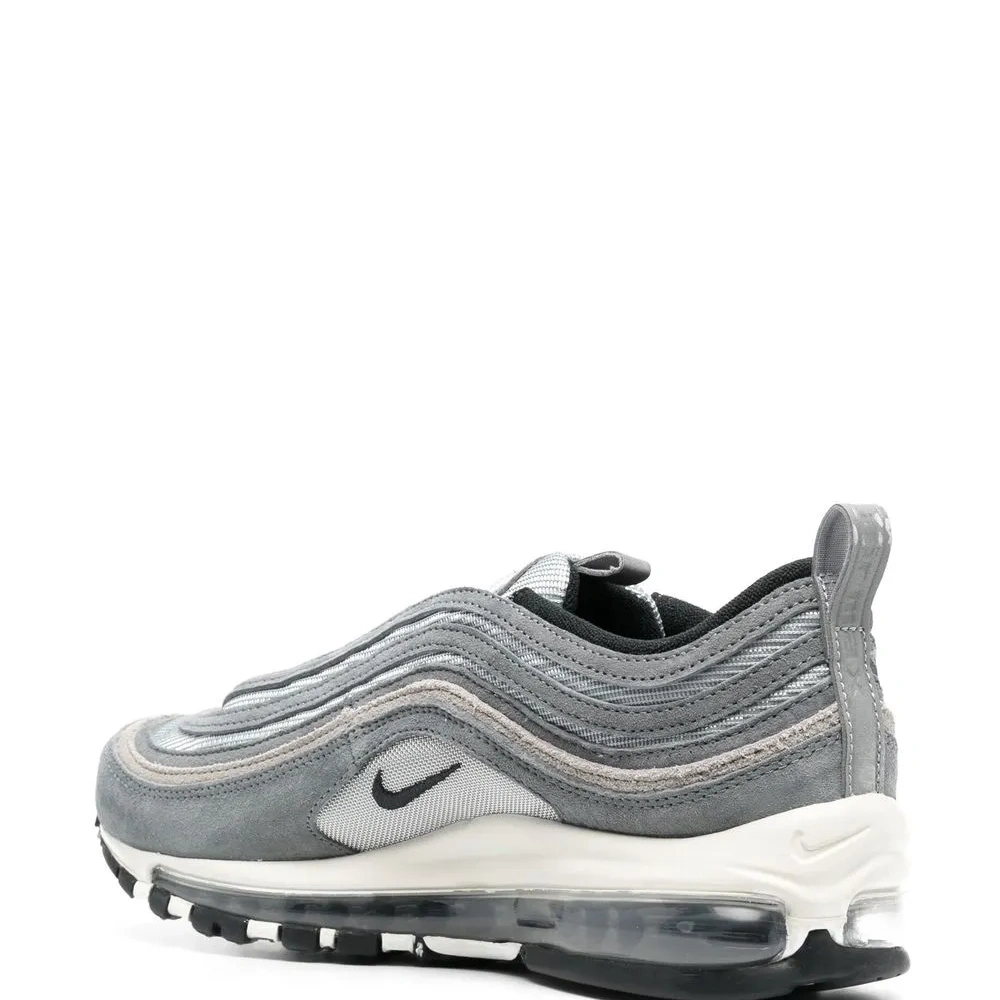 Серый, замша, вставки, логотип Nike Swoosh, светоотражающие детали, полоски, нашивка с логотипом на язычке, подошва Air Max, двойная петля для подтягивания, шнуровка спереди, логотип на стельке и закругленный носок.
