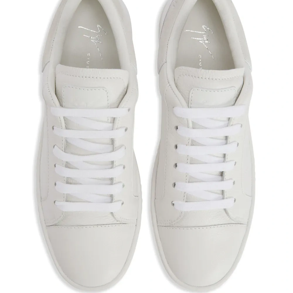Кремовый, кожа, зернистая текстура, нашивка с логотипом на язычке, задник с логотипом, закругленный носок, шнуровка спереди, стелька с логотипом и плоская подошва.