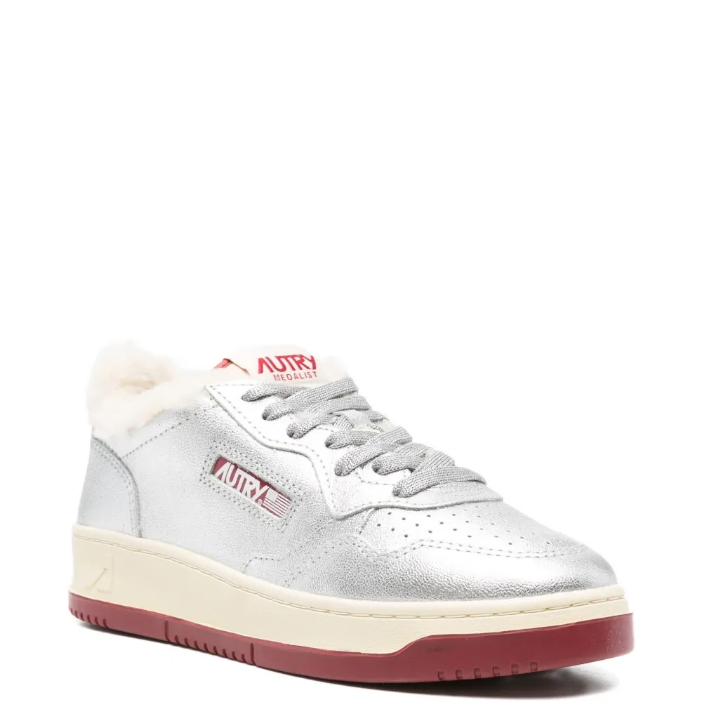 серебристого оттенка металлическая кожа подкладка из овчины отделка каблука красного цвета шнуровка плоская подошва