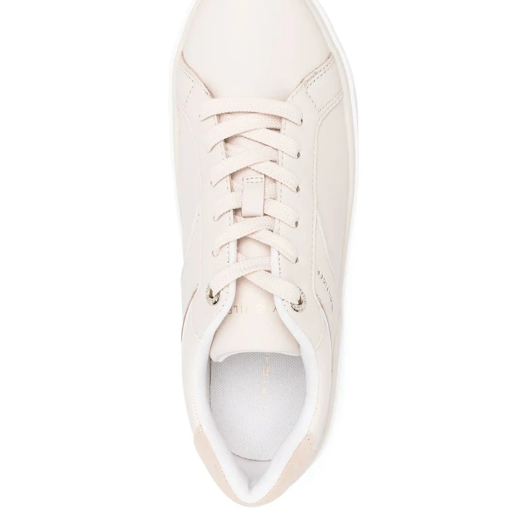Светло-розовый, телячья кожа, тисненый логотип сбоку, шнуровка спереди, контрастный задник, закругленный носок и плоская резиновая подошва.