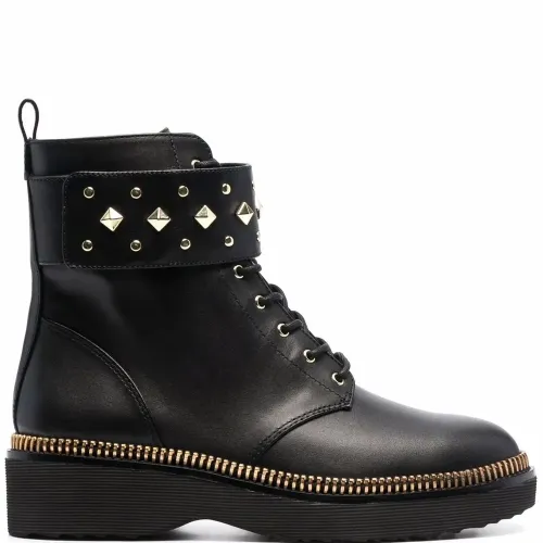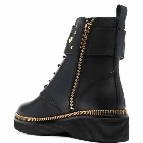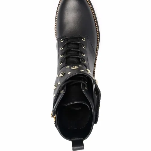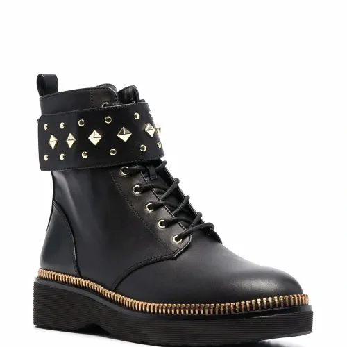 Заклепки-шипы, контрастная строчка, закругленный носок, шнуровка спереди, рифленая резиновая подошва, застежка на молнии сбоку и петля для подтягивания сзади. Цвет: черный.