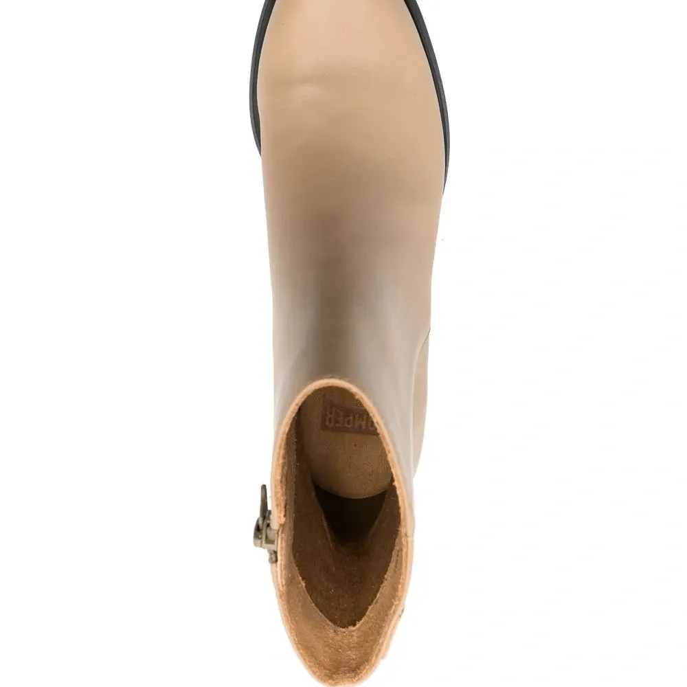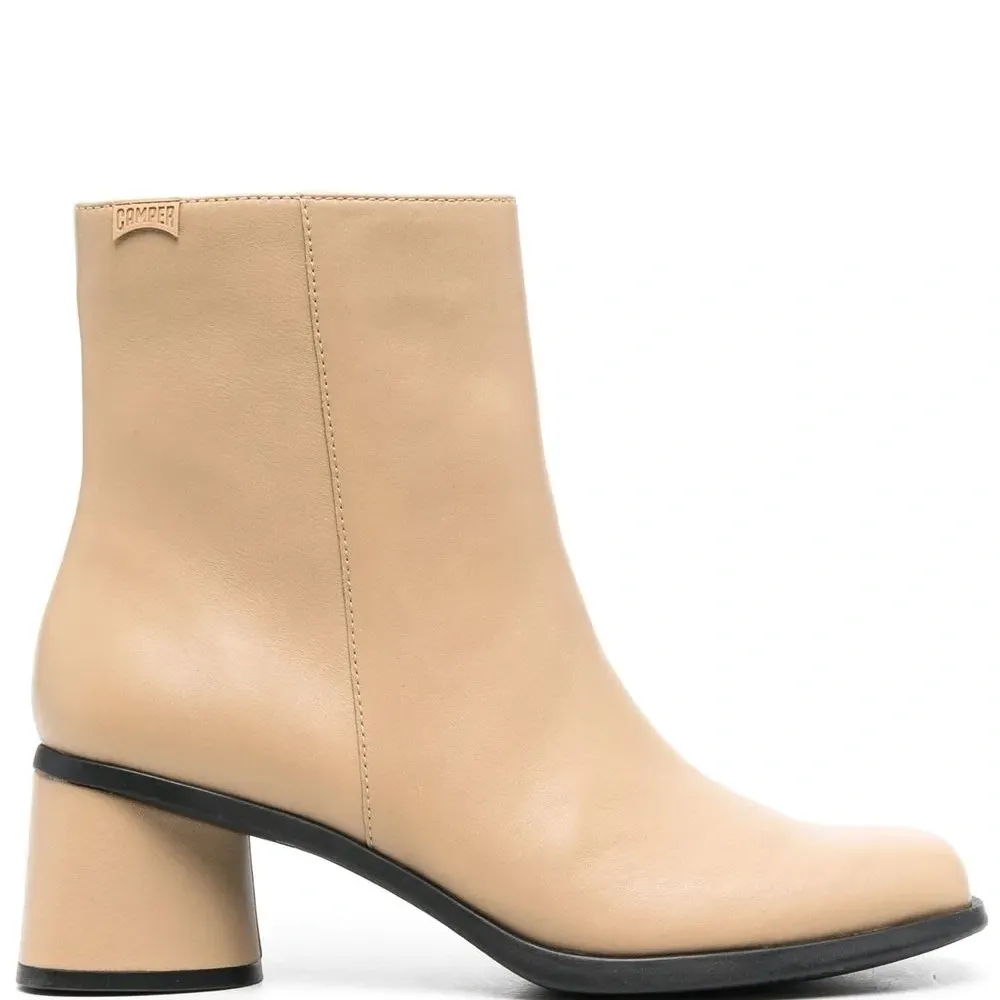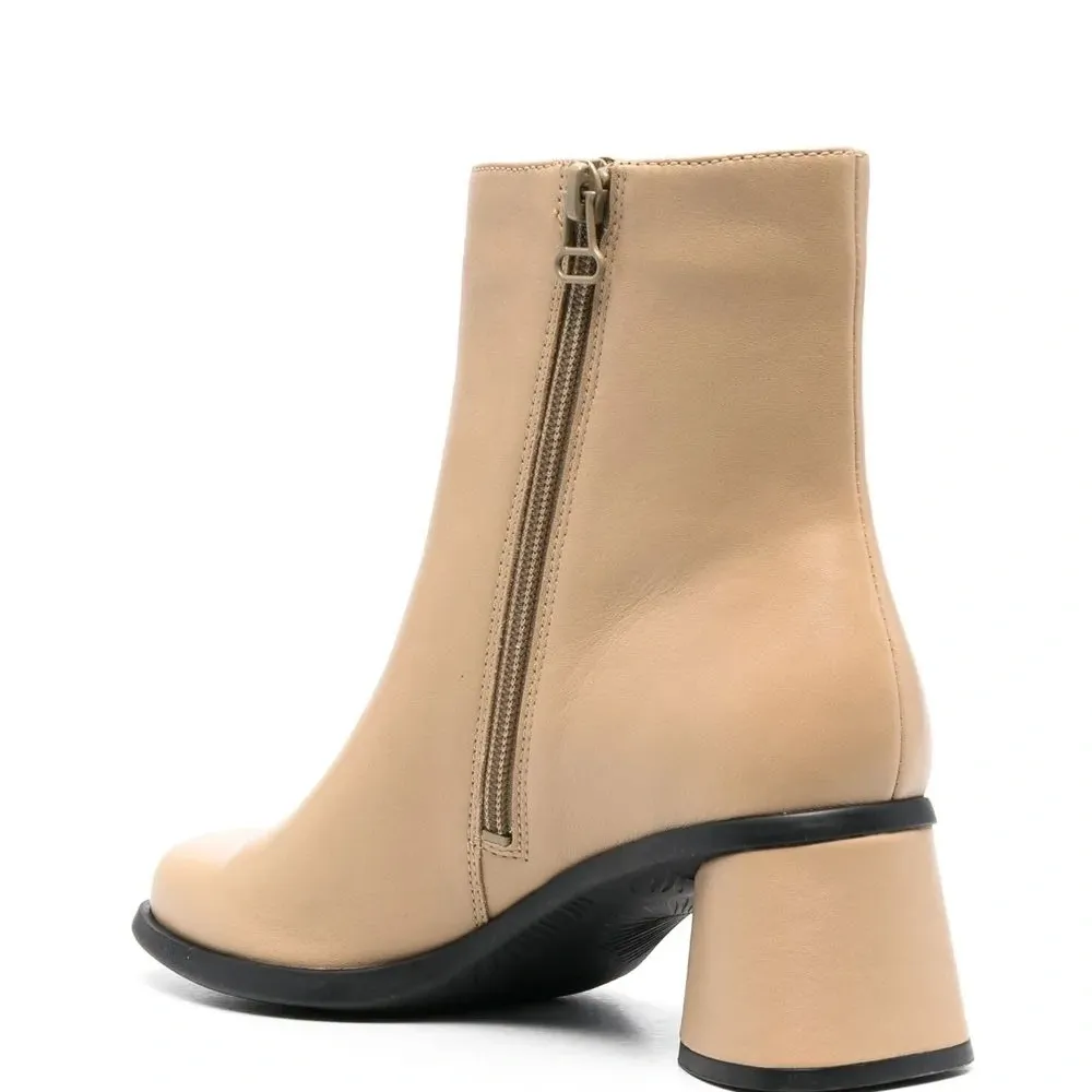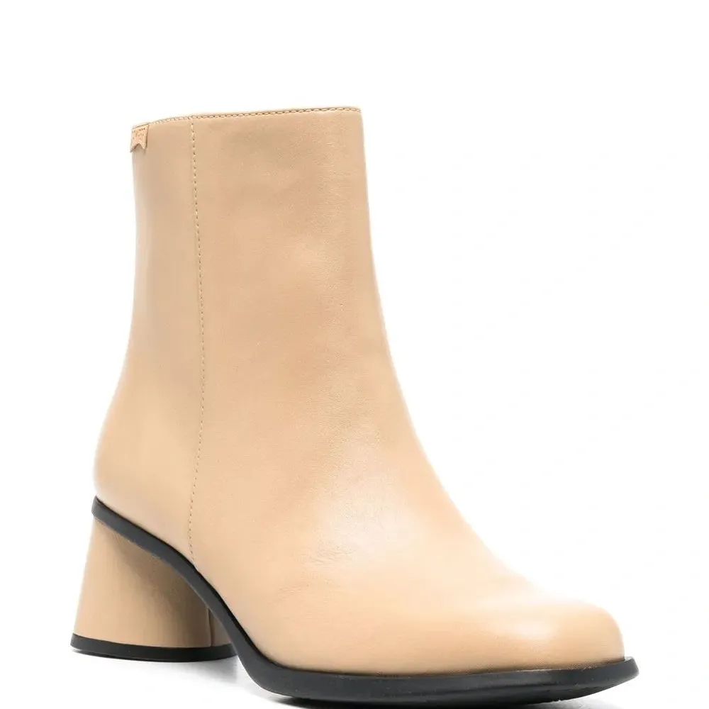 Бежевый, кожа, закругленный носок, застежка на молнии сбоку и низкий блочный каблук.