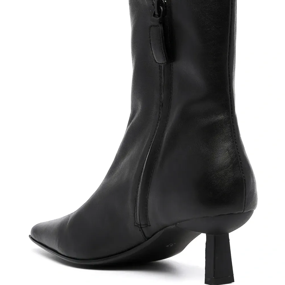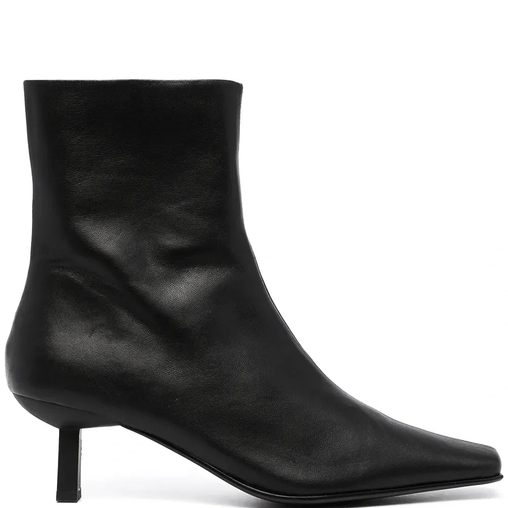 Зернистая текстура, миндалевидный носок, застежки на молнии сбоку, кожаная стелька с логотипом и каблук-рюмка. Цвет: черный.